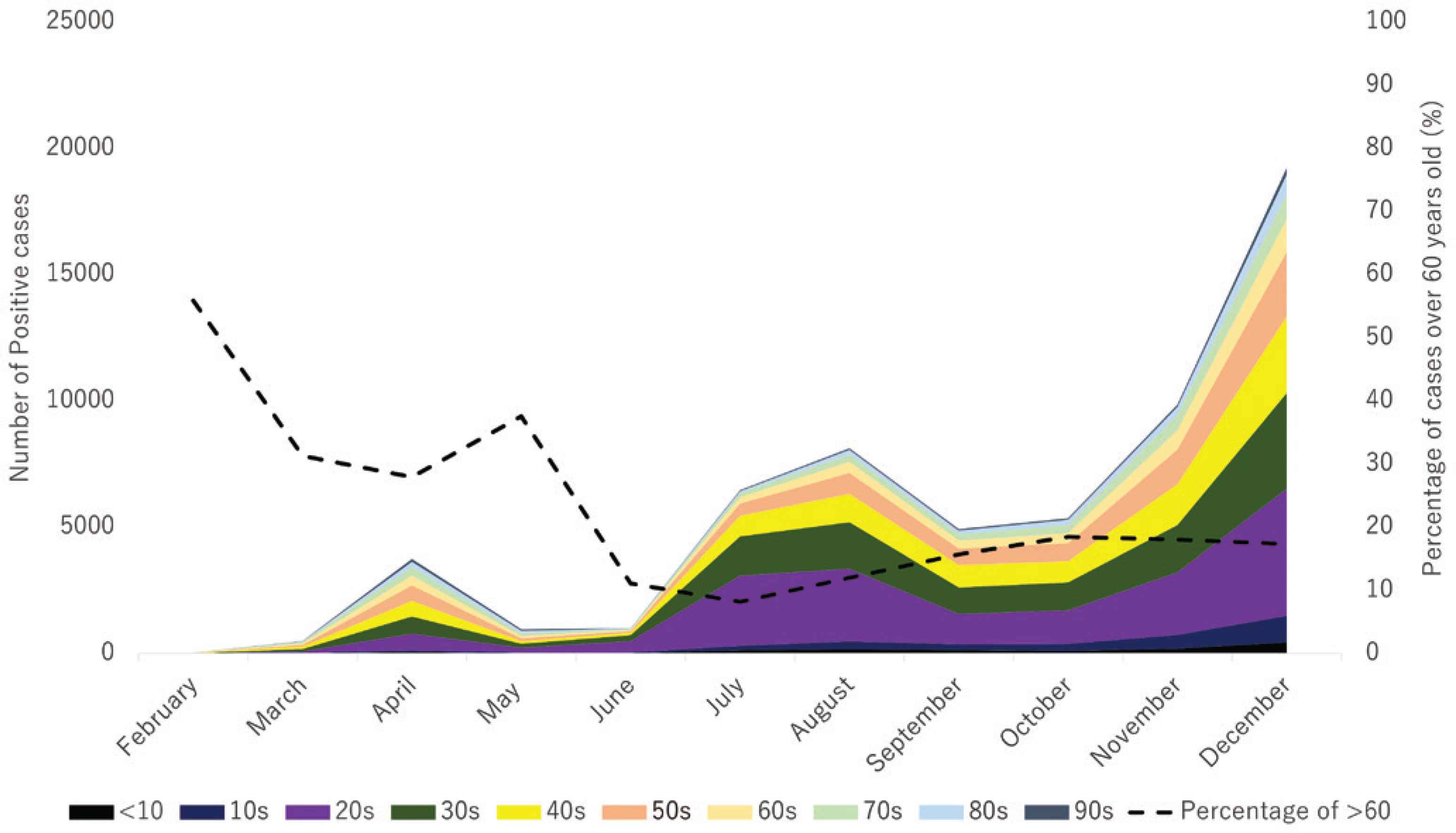However, even if we are to implement CFR as an evaluation method for each policy, the question of how to sample the measurement period remains unanswered. To determine the optimal period for CFR measurement, we calculated the CFR of COVID-19 in Japan on a daily, weekly, and monthly basis during the year 2020. We used the open access data provided by the Ministry of Health, Labour and Welfare of Japan [7], and divided the daily number of deaths by the positive cases. We used data beginning on January 16, when the initial case was identified in Japan, to December 31, 2020, but excluded the data prior to February 12 from our study, as either the number of deaths or positive cases were zero. Our results (Figure 1) showed that compared to daily trends, the weekly and monthly trends seem to mirror each other, but the sensitivity may be different. In Japan, the number of positive cases surge three times, beginning around April, August and November, respectively. However, the CFR did not rise subsequently to the surge in August and November. This may suggest that the social and medical tactics implemented after the first surge has been effective to save patients from dying, even during the increase of the number of positive cases. In other words, this may imply the effectiveness of treatment against COVID-19 in Japan after its initial surge. One possible reason of these results in Japan may be the prevention of the elderlies becoming infected. According to the Tokyo Metropolitan Government [8], after the surge in April, the main population of the infected patients shifted to the younger generation, possibly protecting the elderlies dying from the disease (Figure 2). However, this result is not to deny that the current situation in hospitals were at a scrape with the lack of medical resources such as medical professionals and necessary medical equipment. Our analysis offers a praise to the medical staff in Japan that is literally “hanging in there”.