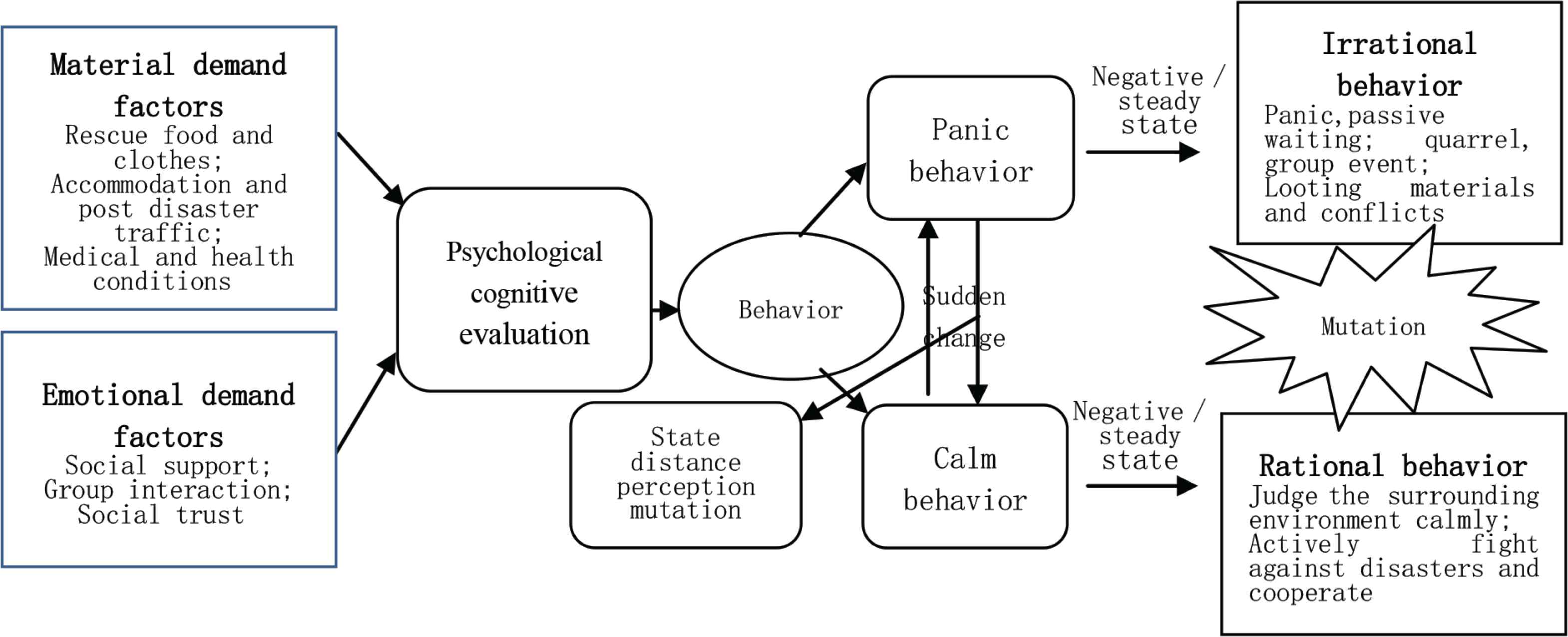 With the increasingly prominent problem of global climate change, the frequency of all kinds of natural disasters is increasing, and the scope of impact is becoming wider and wider. According to the statistics of the civil affairs bureau, all kinds of natural disasters in China have caused 243,533 million disasters, 1583 deaths, 6017 million emergency relocation in 2014, and the direct economic losses have reached 337,38 billion yuan [1]. Natural disasters not only cause a large number of casualties and economic losses, but also cause varying degrees of psychological trauma to the affected people, which may affect individual behavior in the short-term or even in the long-term [2]. Many cases have shown that anxiety in disaster scenarios can urge the affected children to make some aggressive behaviors [3], these experiences of negative psychological behaviors will increase the difficulty of rescue and resettlement. If it is not alleviated in time and effectively, it will accumulate gradually, and easily turn into illegal behavior, or even evolve into group events [4] and reduce the stability and safety of society [5,6]. Behavior analysis of the disaster victims plays an important role in crisis management, disaster emergency response and implementation of evacuation plan [7], and is also one of the core scientific issues in emergency management of public emergencies [8]. Therefore, in order to rescue effectively and block the evolution and upgrading of individual events, and scientifically formulate rescue strategies after the disaster, it is necessary to deeply analyze the mutation mechanism of individual psychological behavior state of the affected people after natural disasters.