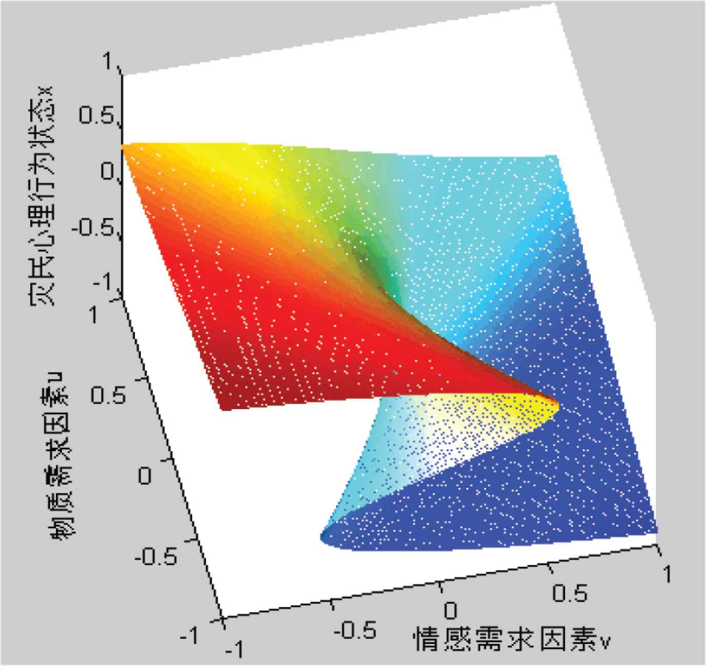 The psychological behavior surface M of the victims is the set of equilibrium points of the catastrophe model, i.e., the equilibrium surface of the catastrophe model, as shown in formula (2).