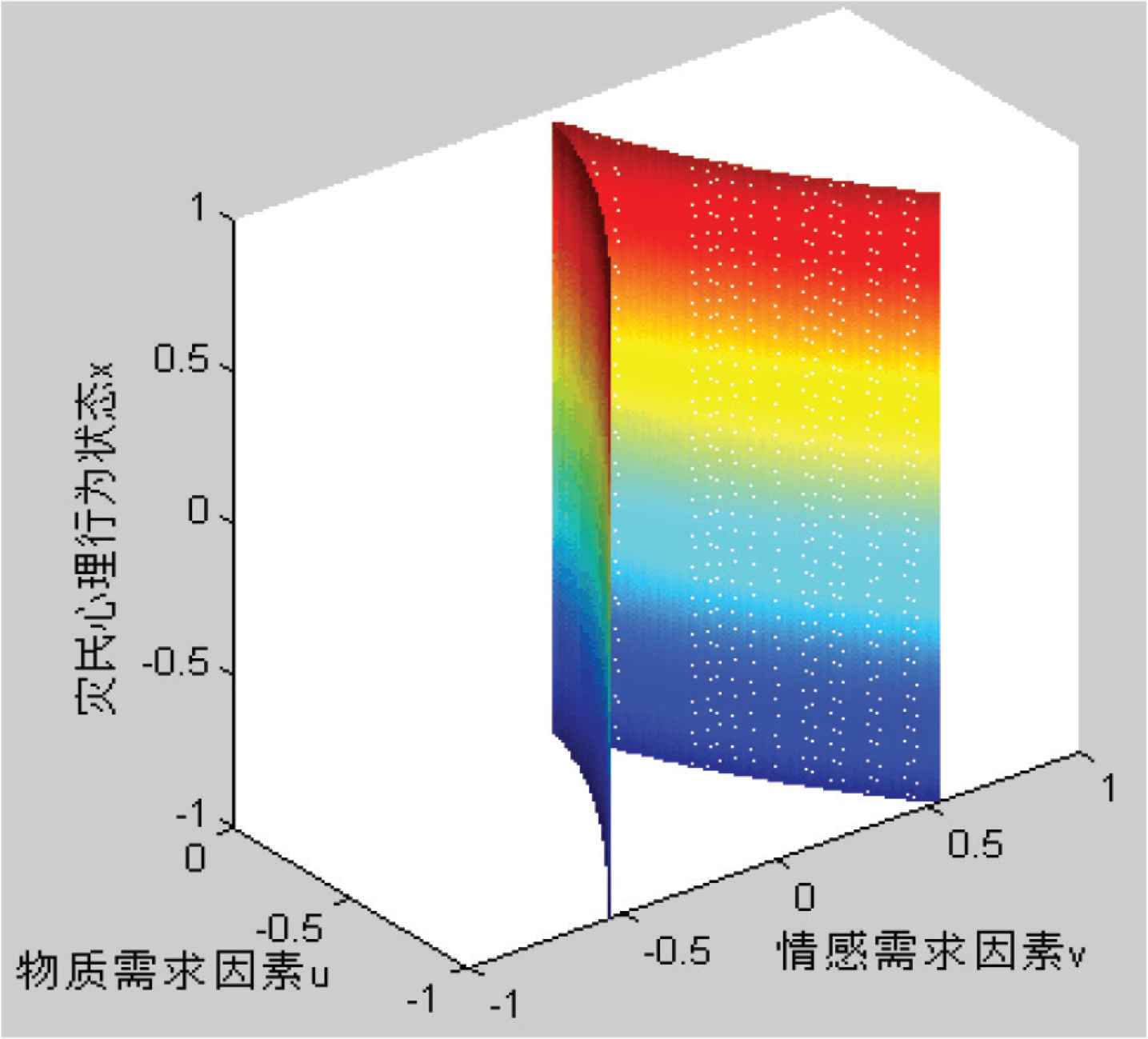 Case 1: when the material demand of the victims is greater than zero, i.e., when u > 0, 8u3 + 27v2 > 0, formula (4) has no solution, and the individual psychological behavior curve of the victims does not go through bifurcation set. With the continuous change of v, the psychological behavior state of the victims is only continuous change, and there is no jump phenomenon;