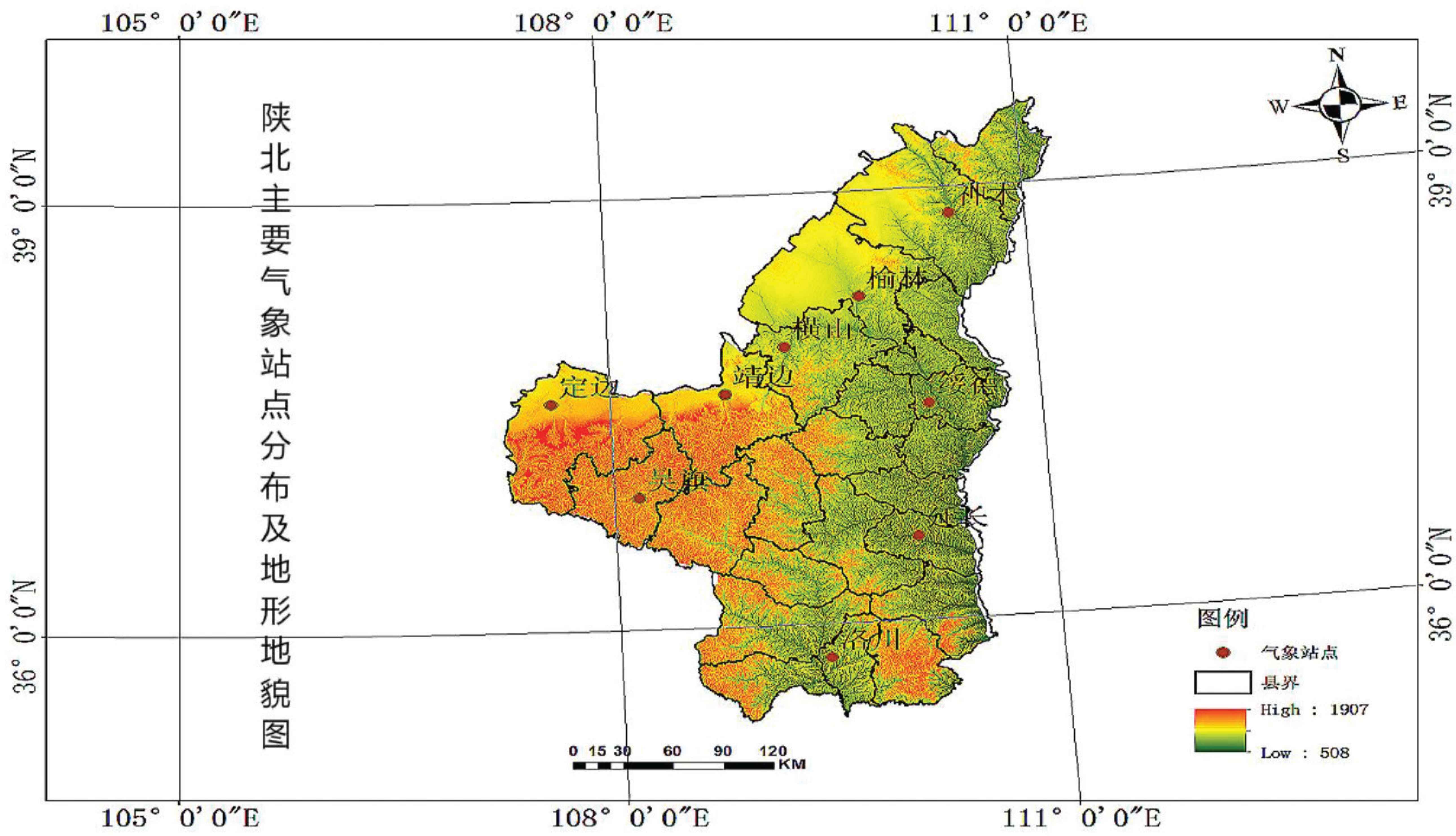 陕北气象站点及地形地貌示意图.