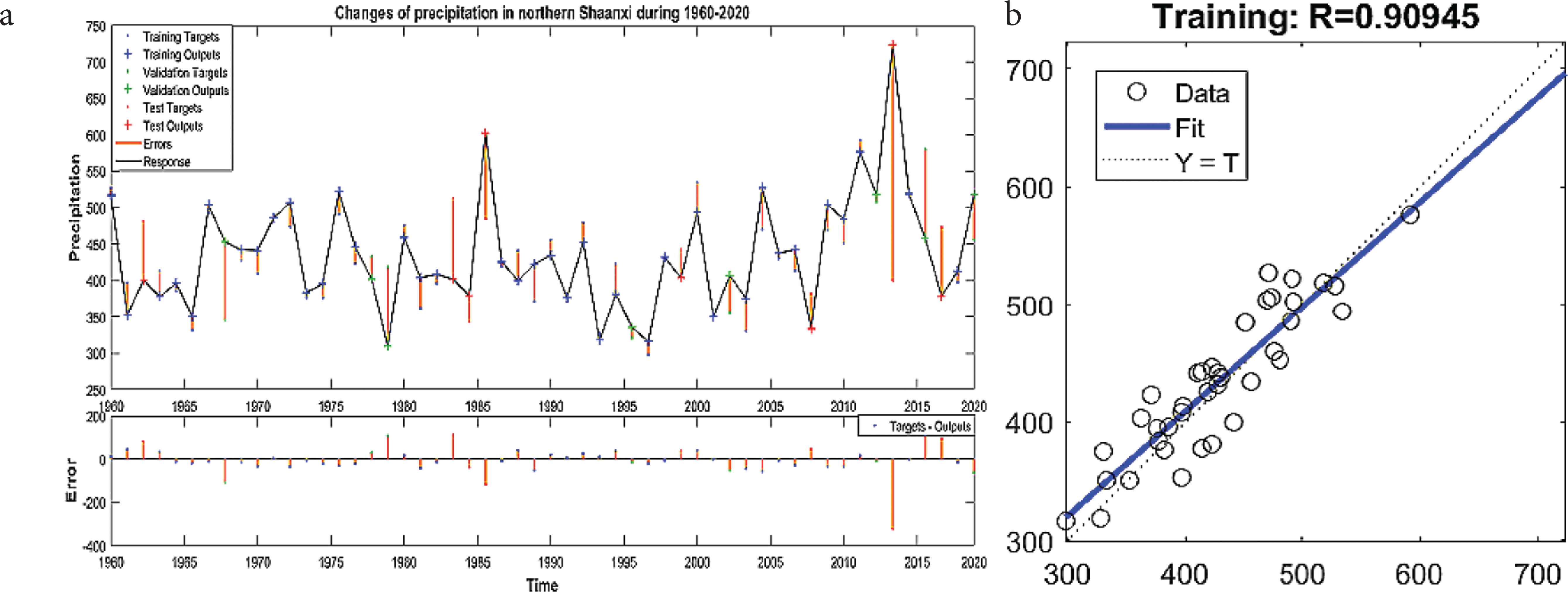 对于降水和气温的神经网络时间序列模型,本文对降水和气温模拟时都设置了神经元数10个,隐含层7个。