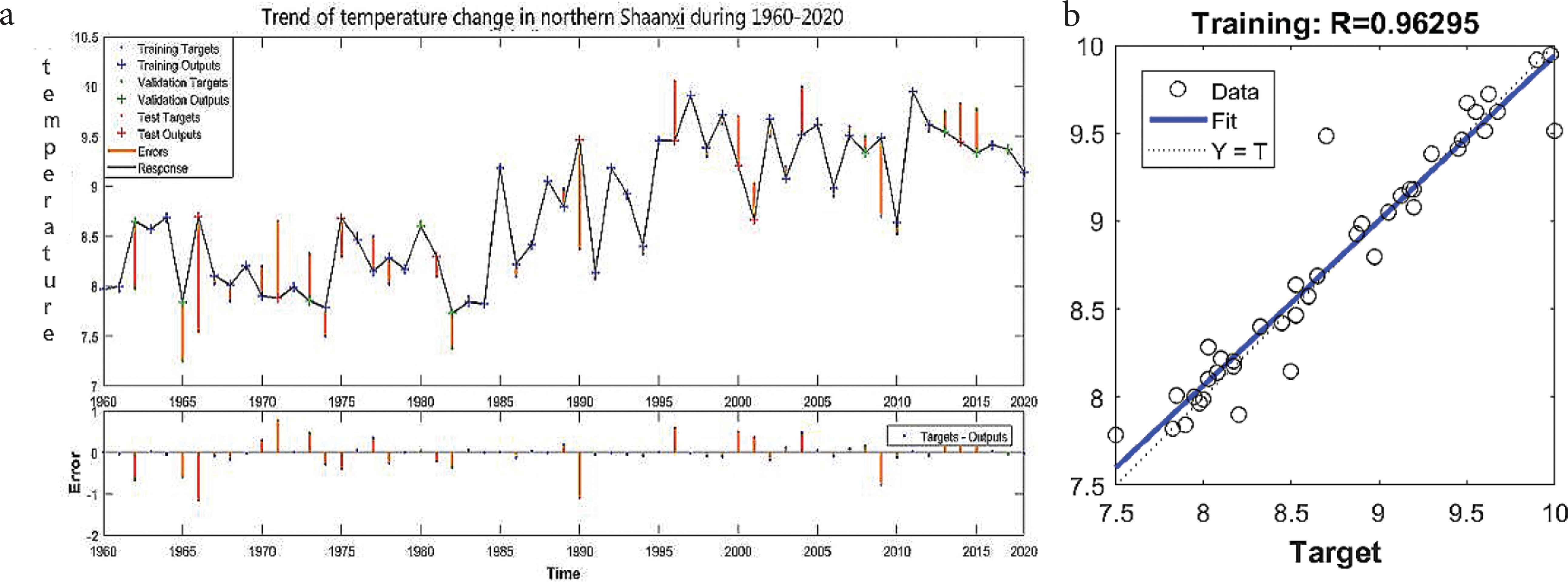 陕北1960–2020年气温变化趋势拟合结果 (a) 与拟合优度(b).