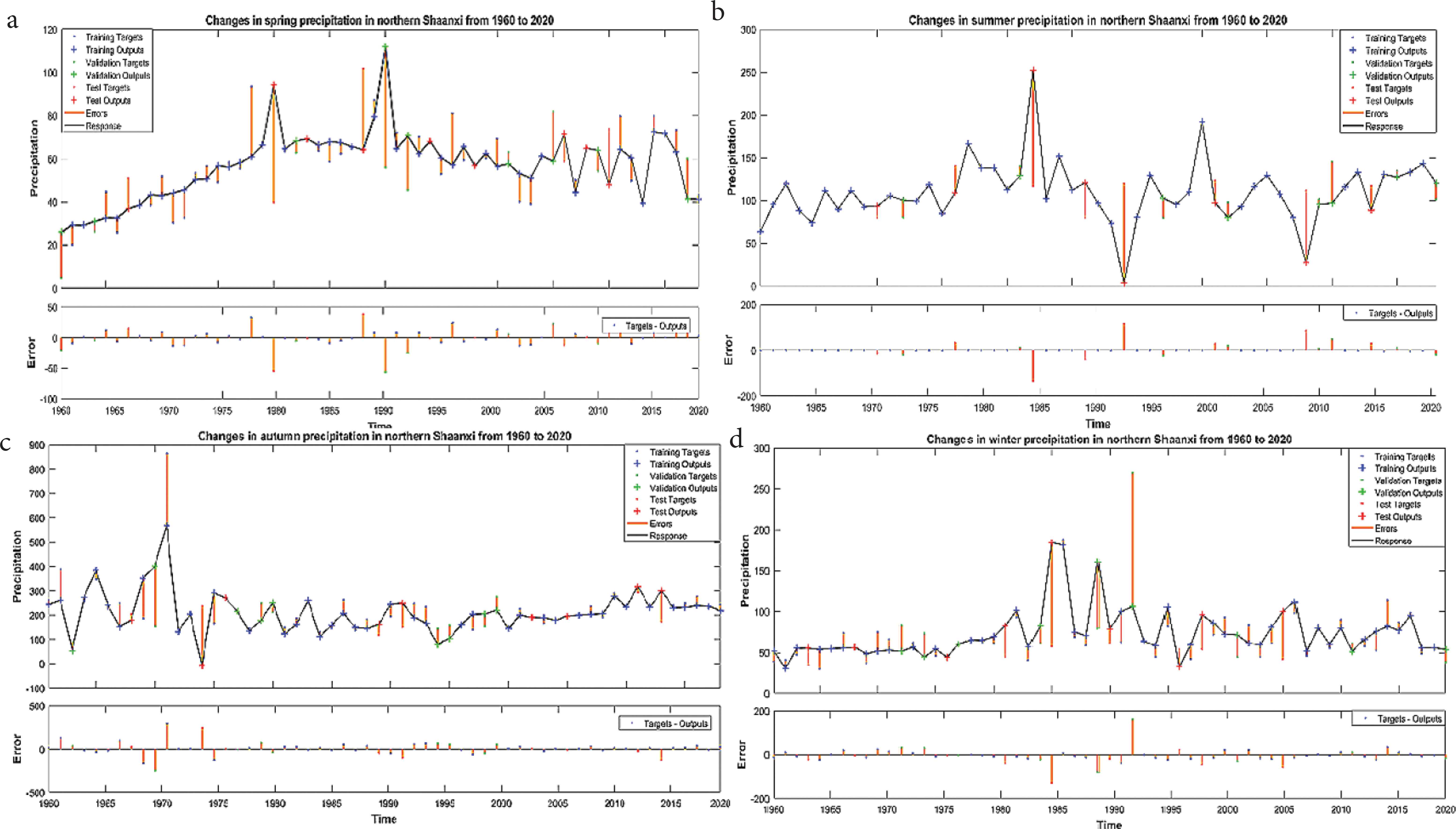 陕北1960–2020年降水变化趋势拟合结果 (a) 春季 (b) 夏季 (c) 秋季 (d) 冬季.