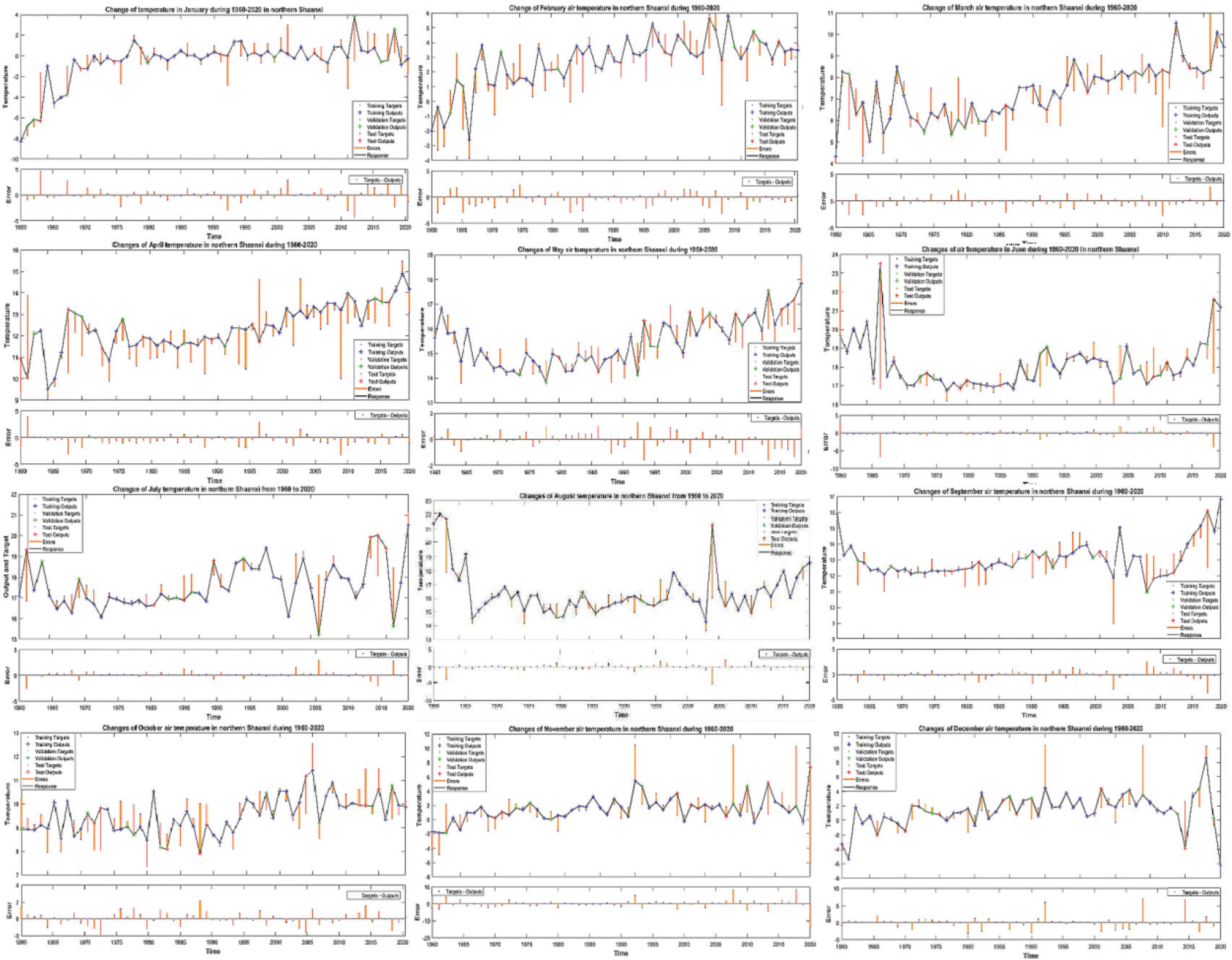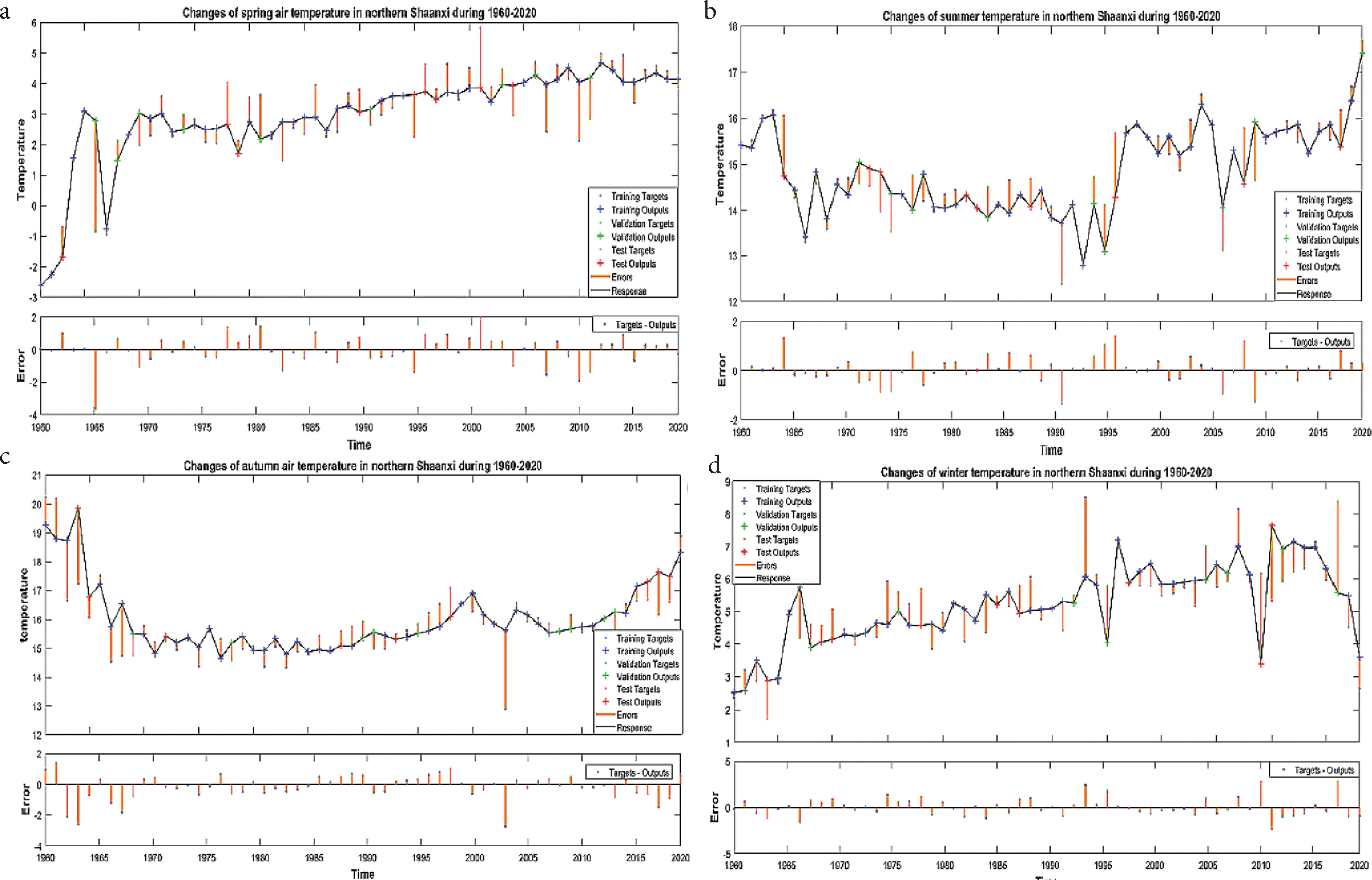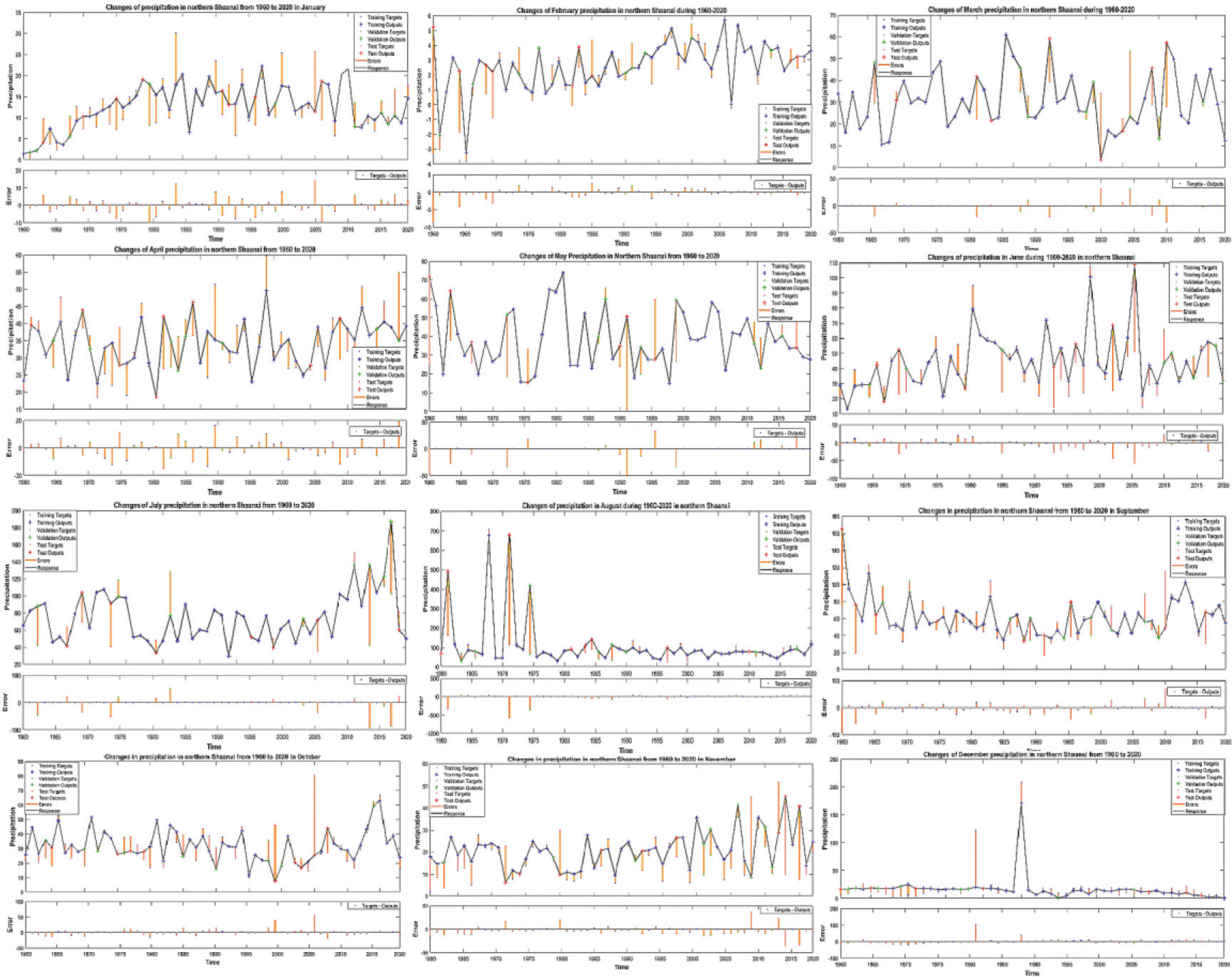 总的来说,气温在这60年呈上升趋势,平均气温为9.2摄氏度。IMF1反映陕北2a、4a准周期的气温变化,从1960年–1978年主要存在2a准周期的上下震荡,1978–2014年呈4a准周期的震荡,2014年以后有轻微的上升。IMF2反映陕北6a、7a为准周期的气温变化.其中,1960年–1996年主要呈6a准周期的上下震荡,1996年–2014年呈6a周期的上下震荡,2014年以后有轻微的下降,说明陕北气温近60年来以6–7a为尺度会有稍微的下降。R = 0.96,接近于1,说明神经网络时间序列模型能较好反映陕北近60年气温变化规律[10]。