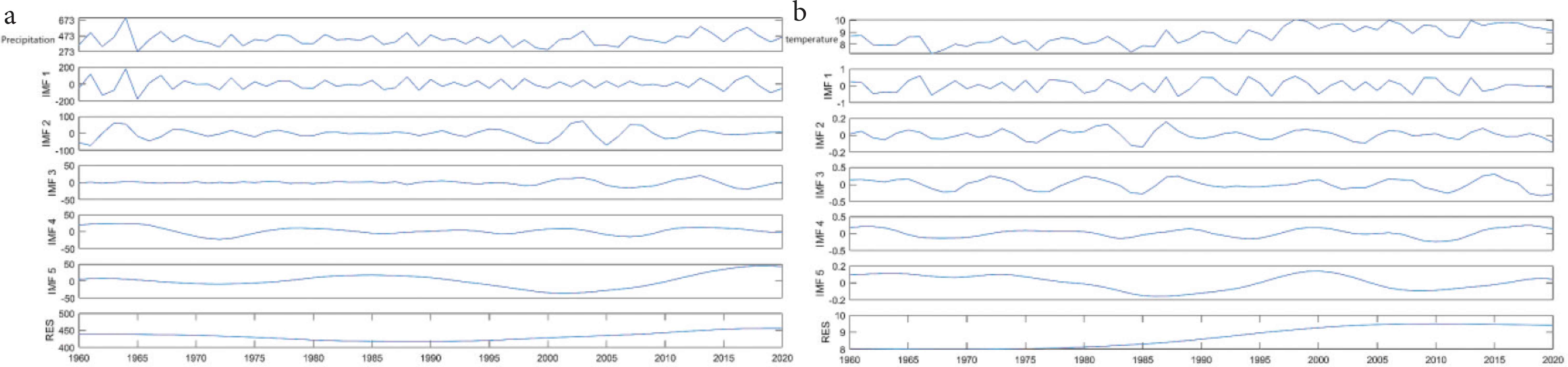 至于气温大致与降水的变化趋势一致(图3)。IMF1–IMF2反映气温的年际变化周期为准2a、4a、6a、7a.其中,气温呈波动上升趋势的时间段为1971–1975、1988–2001以及2012–2020这三个阶段;呈波动下降趋势的时间段是1960–1971、1975–1988以及2001–2012这三个阶段。