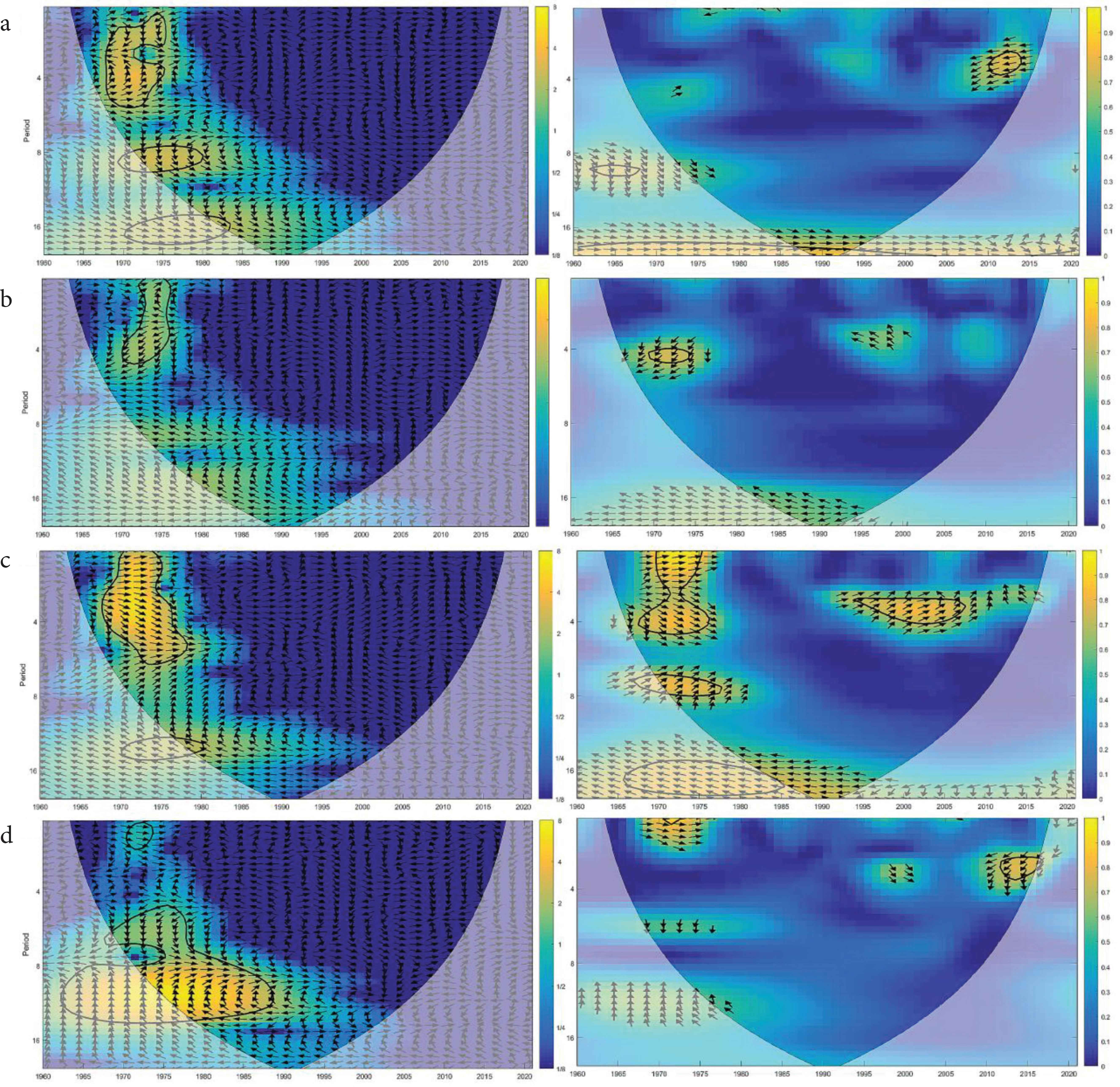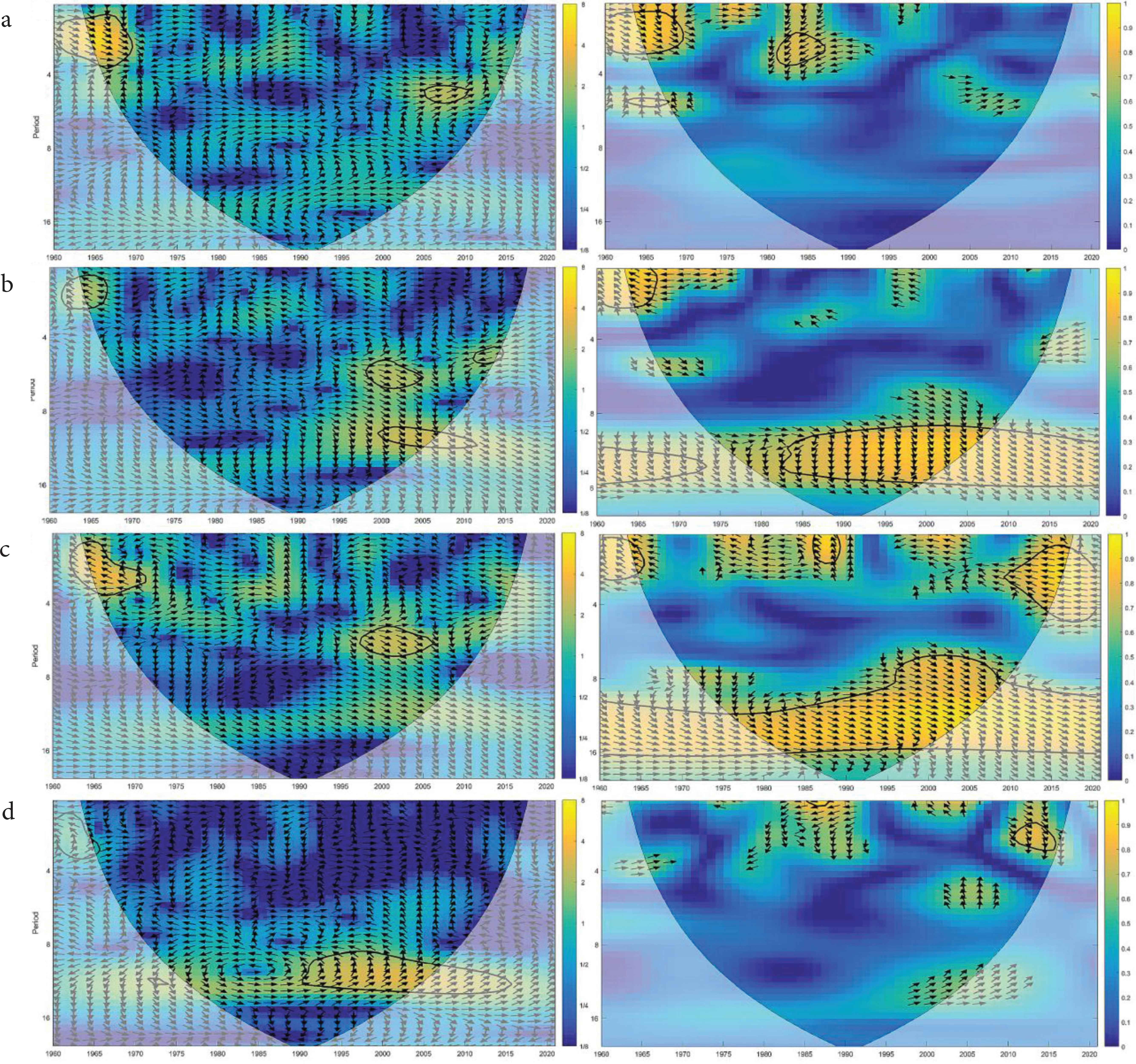 陕北1960–2020年平均气温与各指数交叉小波和小波相干分析结果:(a)AO指数,(b)PDO,(c)SST指数,(d)太阳黑子相对数.