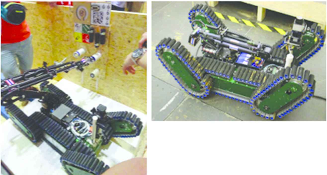 The structure of the iRAP rescue robot is an original platform for the rescue robot which has two pairs of flippers (in the front and in the rear) as shown in Figure 2. In addition, the 6-DOF robotic arm (one prismatic joint and five revolute joints) is set up on a body of the robot, to search and observe the victim and situation in the surrounding area. The multi-sensors are installed in the end-effector of robotic arm, and also, the camera on the robotic arm is used for recognizing the Hazmat chart autonomously.