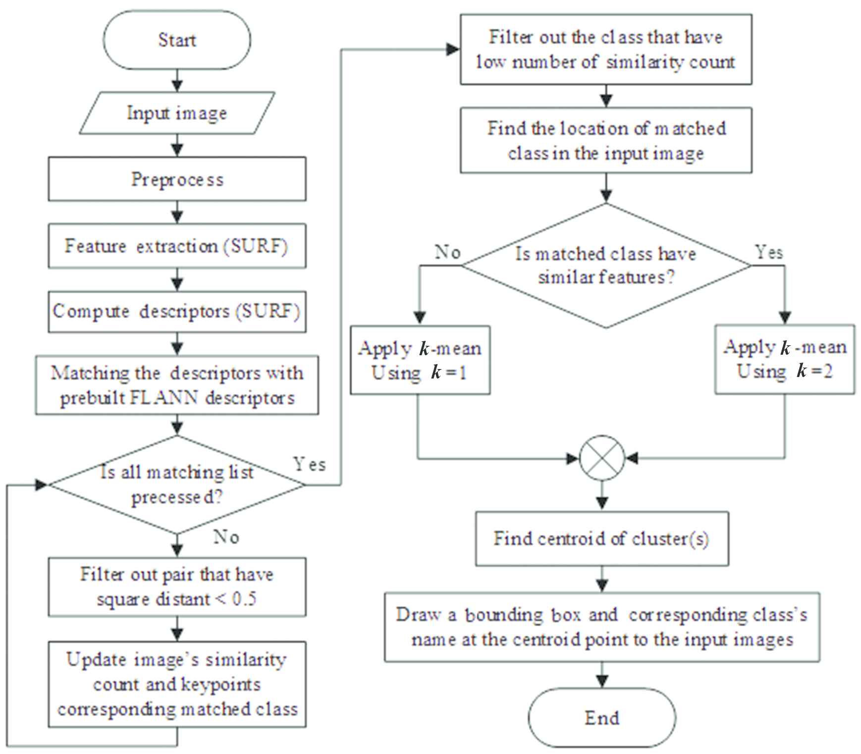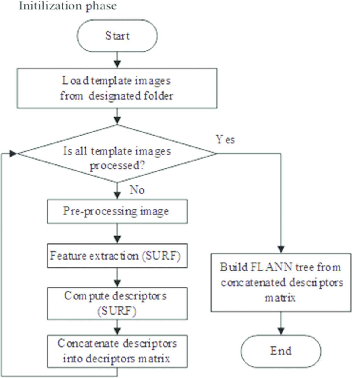 The proposed paper that presents the Speeded-up Robust Feature (SURF) method [2] for extraction the information from the image and then using the Fast Library for Approximate Nearest Neighbors (FLANN) model [3–5], which is used to match the input image with Hazmat chart templates. And the system uses blob detection [6] to mark the position of Hazmat chart. The overview system can be divided into two phases: the initialization phase (Figure 3) and the real-time processing phase.