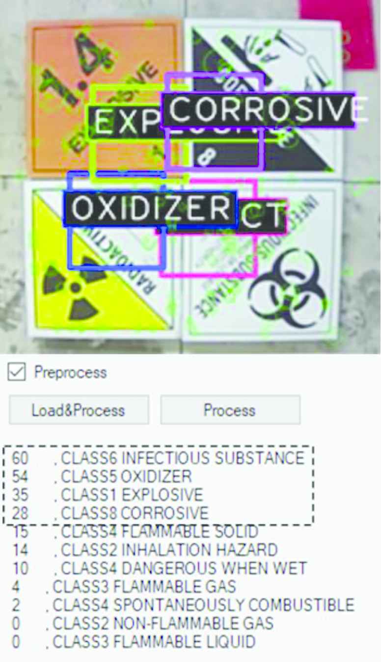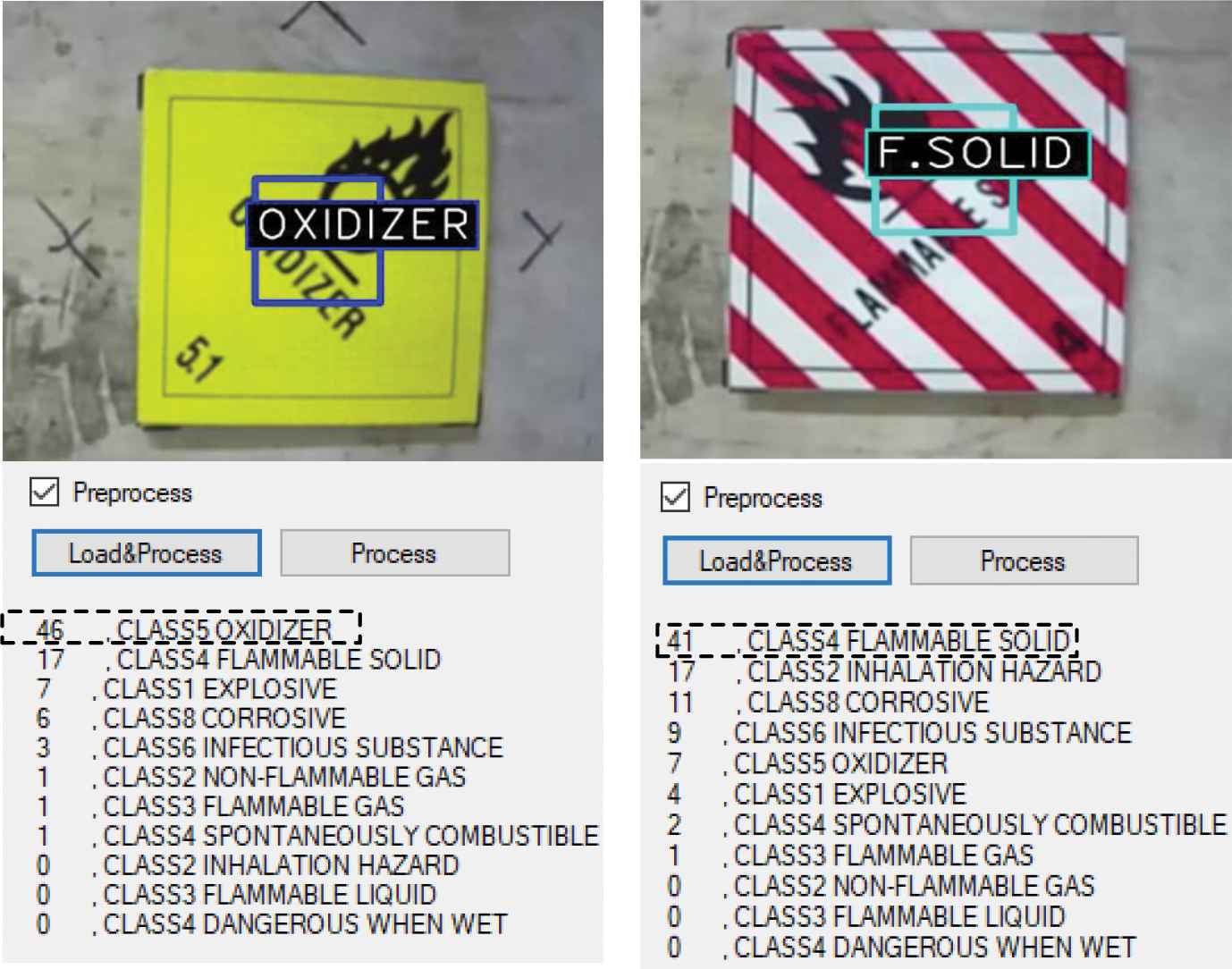 Besides, we had more testing of the proposed method by adding four Hazmat charts as the input image to verify the uncertain image group. In Figure 8, the experimental results show four maximum similarity scores such as “INFECTIOUS SUBSTANCE (Class6)”, “OXIDIZER (Class5), “EXPLOSIVE (Class1)”, and “CORROSIVE (Class8)”, which were matched with the training images. The results that confirm the proposed method can classify and identify the Hazmat chart accurately and correctly. Moreover, our proposed method that could draw the frames and mark the position of each Hazmat chart is based on their density features.