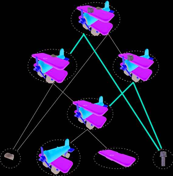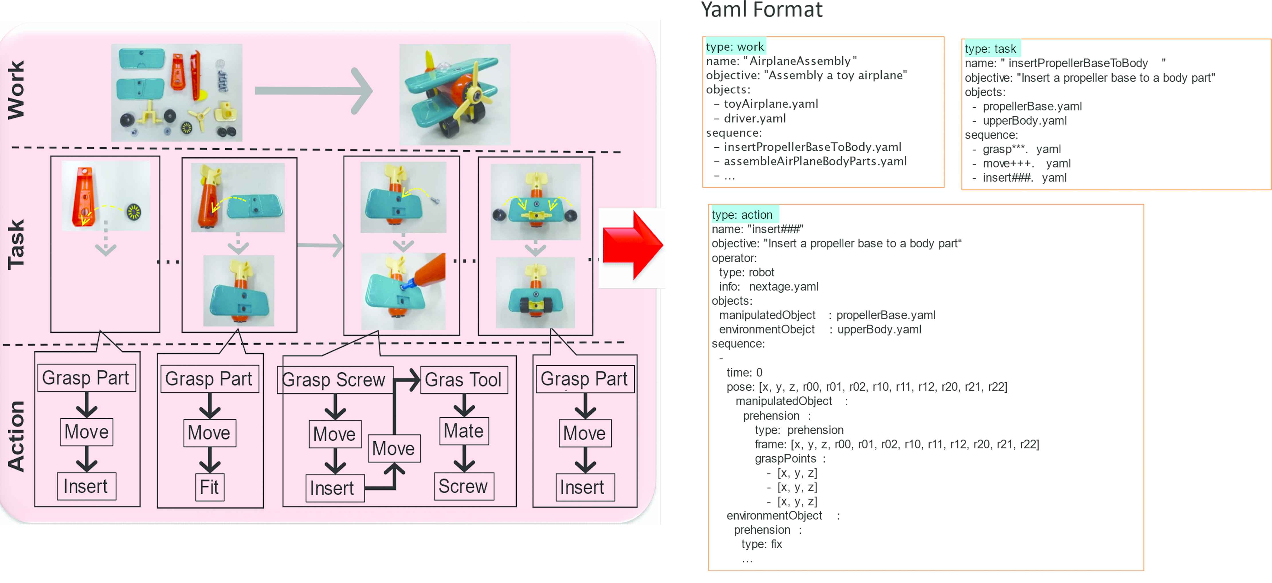 In this section, we explain the structure of the motion data and method for storing skillful motion to the database [1]. An assembly task is composed of multiple task elements where each task element is composed of a set of motion sequence. According to this classification, the first, the second and the third layers are respectively named as “work”, “task” and “action” layers. Figure 1 shows an example of assembly of a toy airplane. Since a single action usually includes multiple objects to be assembled, the object held by a robot is named as the “main object” and the object assembled to the main object is named as the “sub object”. The following is a set of information included in the database: