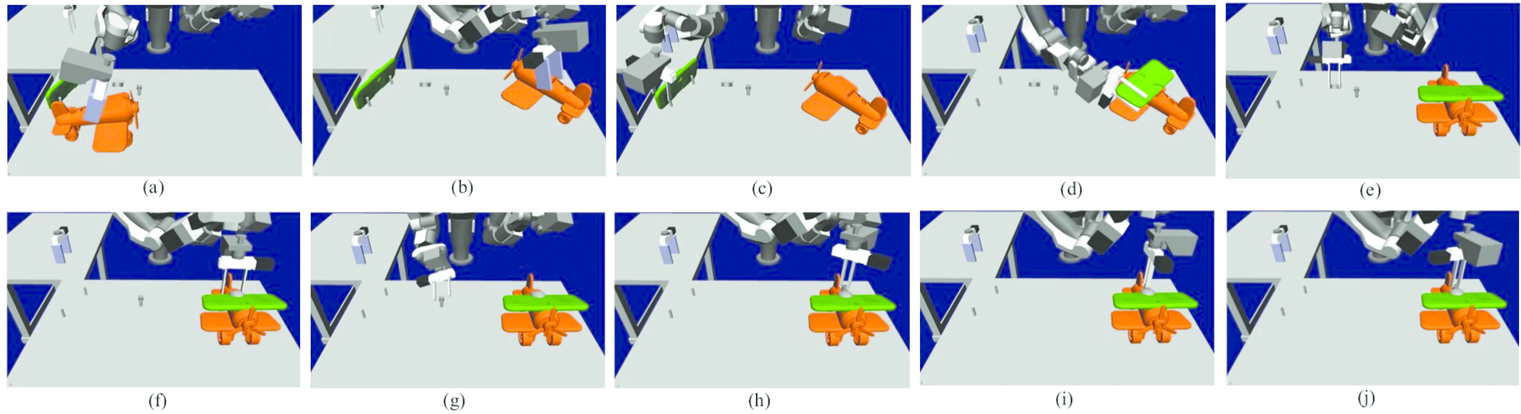Simulation result of toy airplane assembly. (a) Picking the body, (b) Placing the body to the assembly position, (c) Picking the wing, (d) Fitting the wing to the body, (e) Picking the cockpit, (f) Fitting the cockpit to the body, (g) Picking the bolt, (h) Screwing the bolt 1, (i) Screwing the bolt 2, (j) Screwing the bolt 3.