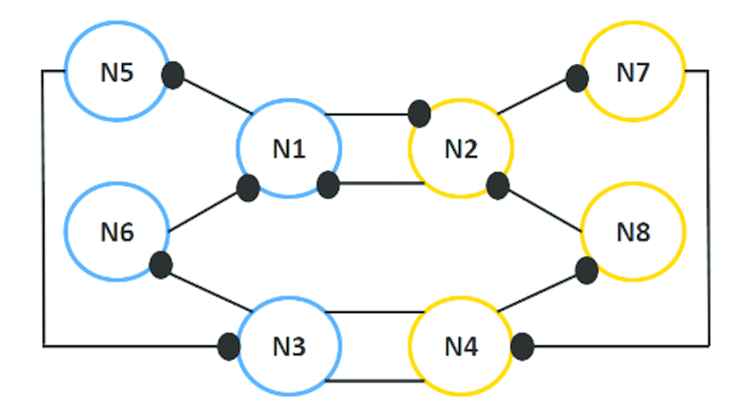 Diagram of the Segmental Oscillator of the Heartbeat of the Leech. The modelling is from Hill et al. [6]. N1–N2 and N3–N4 are two elemental oscillators. N1, N3, N5, and N6 are controlling the left part (blue), N2, N4, N7, and N8, the right part (orange). The 12 black dots represents inhibitory synapses with short-term plasticity. All neurons are excitatory ones.