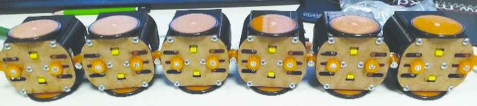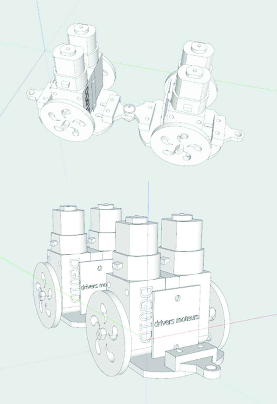 Biomimetic CPGs will control the different motors of the wagons. As the output of the FPGA board is 3.3 V with low current, a power driver for the motors and a VHDL module for converting the CPGs to Pulse Width Modulation (PWM) to control motor speed needs to be added. The PWM frequency should be between 100 Hz and 200 kHz. The duty cycle of the PWM controls the speed of the motor. Pololu_DRV8835 was used for the power driver. Motors are DG01D with a 0.8 kg.cm couple and a no load speed of 90 rpm. Figure 3 shows the 3D structure of the wagons.
