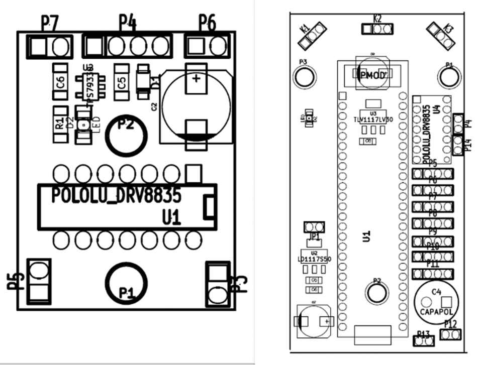 On the left, the electrical circuit of the wagon. On the right, the electrical circuit of the locomotive with the FPGA board.