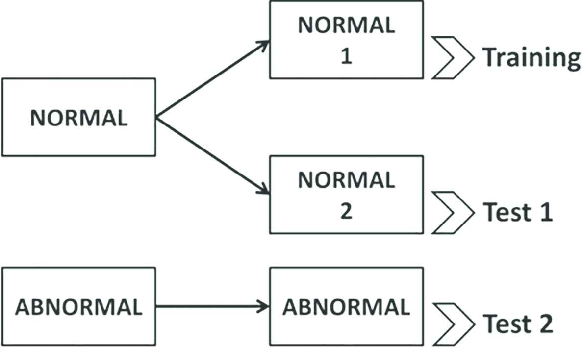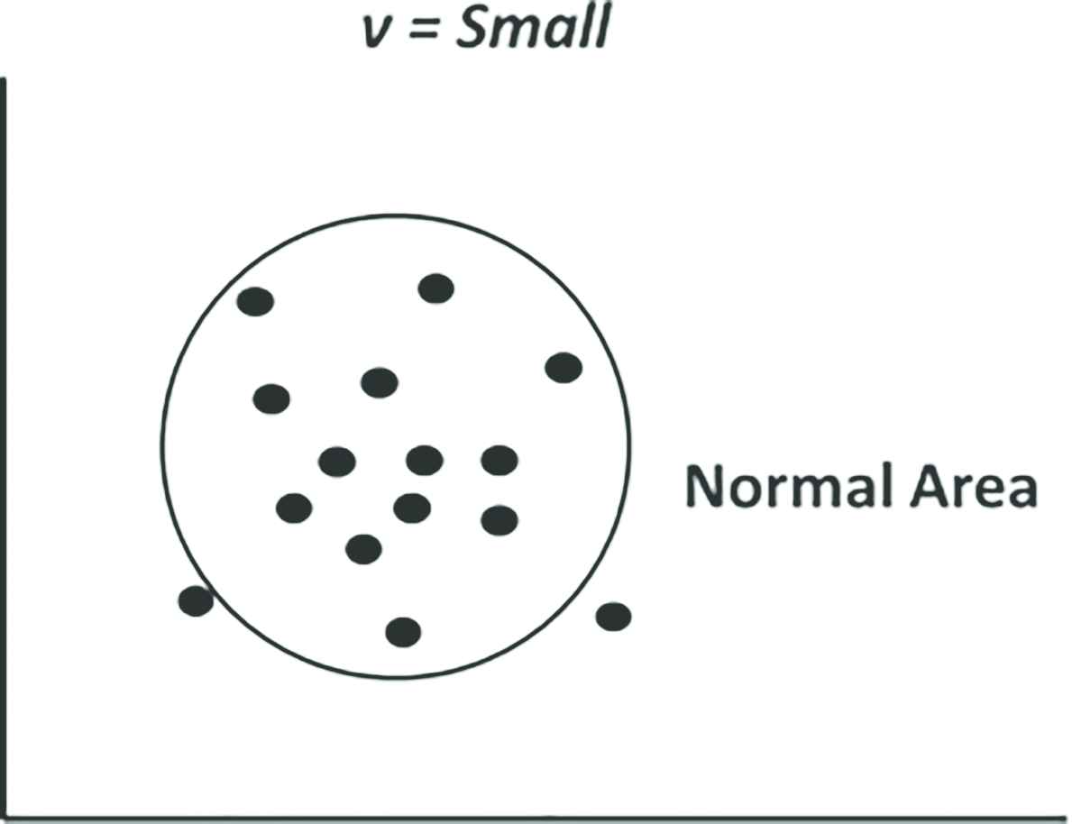 Support vector machine (SVM) is originally a classification algorithm for two classes using supervised learning. OCSVM Figure 3 is an unsupervised learning algorithm that applies SVM to region discrimination problems to estimate the high-density region of data. In other words, OCSVM is an unsupervised outlier detection method. OCSVM is trained using images of normal areas only. Anomaly detection for the testing images is carried out by the trained OCSVM and abnormal images can be detected when they are out of the normal area. OCSVM has a parameter ν that determines the proportion of normal and abnormal areas. For example, when ν is set at a large value as shown in Figure 4, the normal area becomes small. In this case, only the data that is very near to the center of the normal area is regarded as normal. Conversely, when ν is small, the normal area becomes large and it is easier for the data to belong to the normal area as shown in Figure 5. Because there is a trade-off between the false positive (abnormal) and false negative (normal), the value of ν should be determined carefully.
