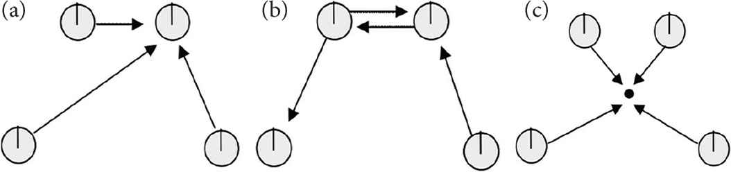 Three different aggregation algorithms: (a) Selecting a robot from each group as leaders. (b) Selecting the neighboring robot as the reference point. (c) Selecting the center of group as the reference point.
