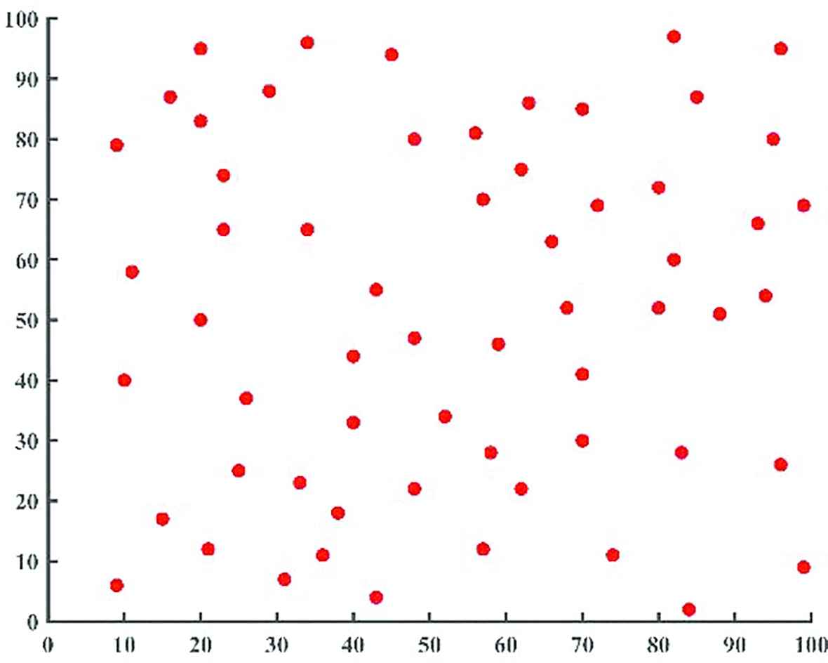 According to the grouping aggregation control algorithm, the research group carried out simulation analysis on the MATLAB. In order to facilitate the observation of the simulation results and analysis, the simulation environment which is a 2-D with a length of 100 and a width of 100 was first configured. About 60 robots were randomly set up in the grid. The initial parameters of the group are configured. The specific parameters are as shown in Table 1. The specific 2-D grid and the initial position of the robot are shown in Figure 2.