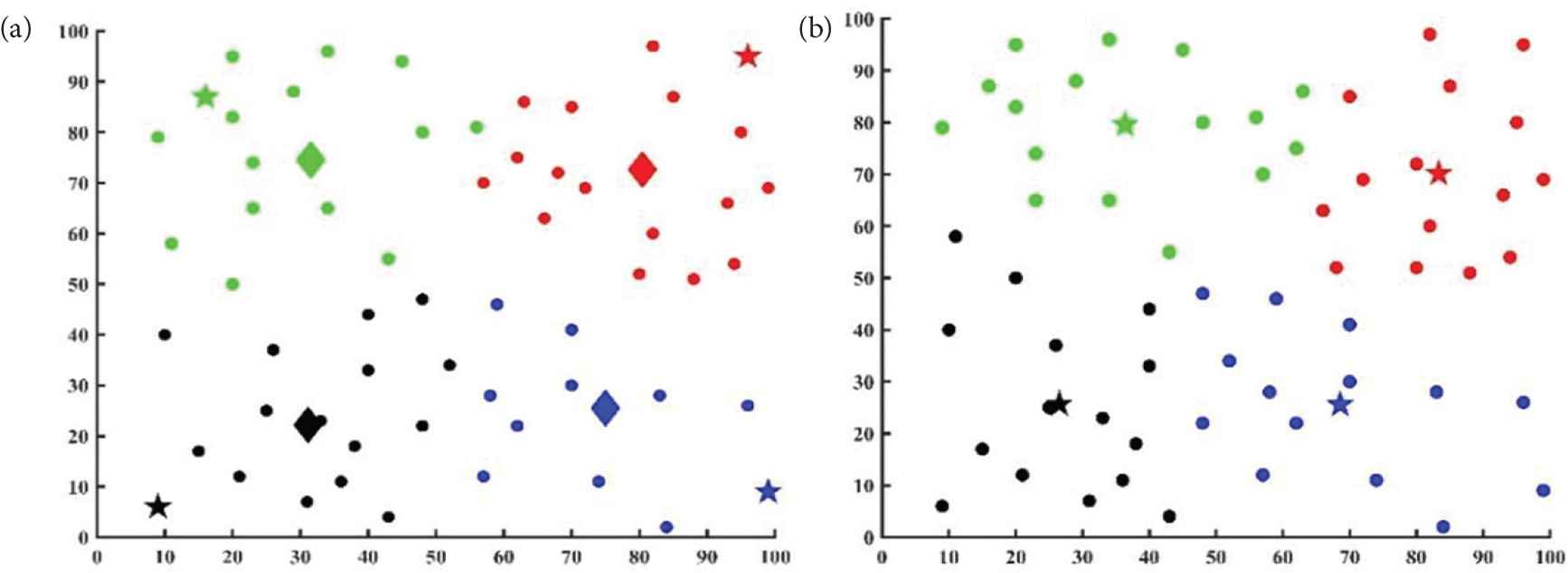 The simulation of grouping process: (a) The results of the first grouping. The initial centers are shown as stars and the new centers after the first grouping is completed are shown as diamonds. (b) The result after the grouping is completed.