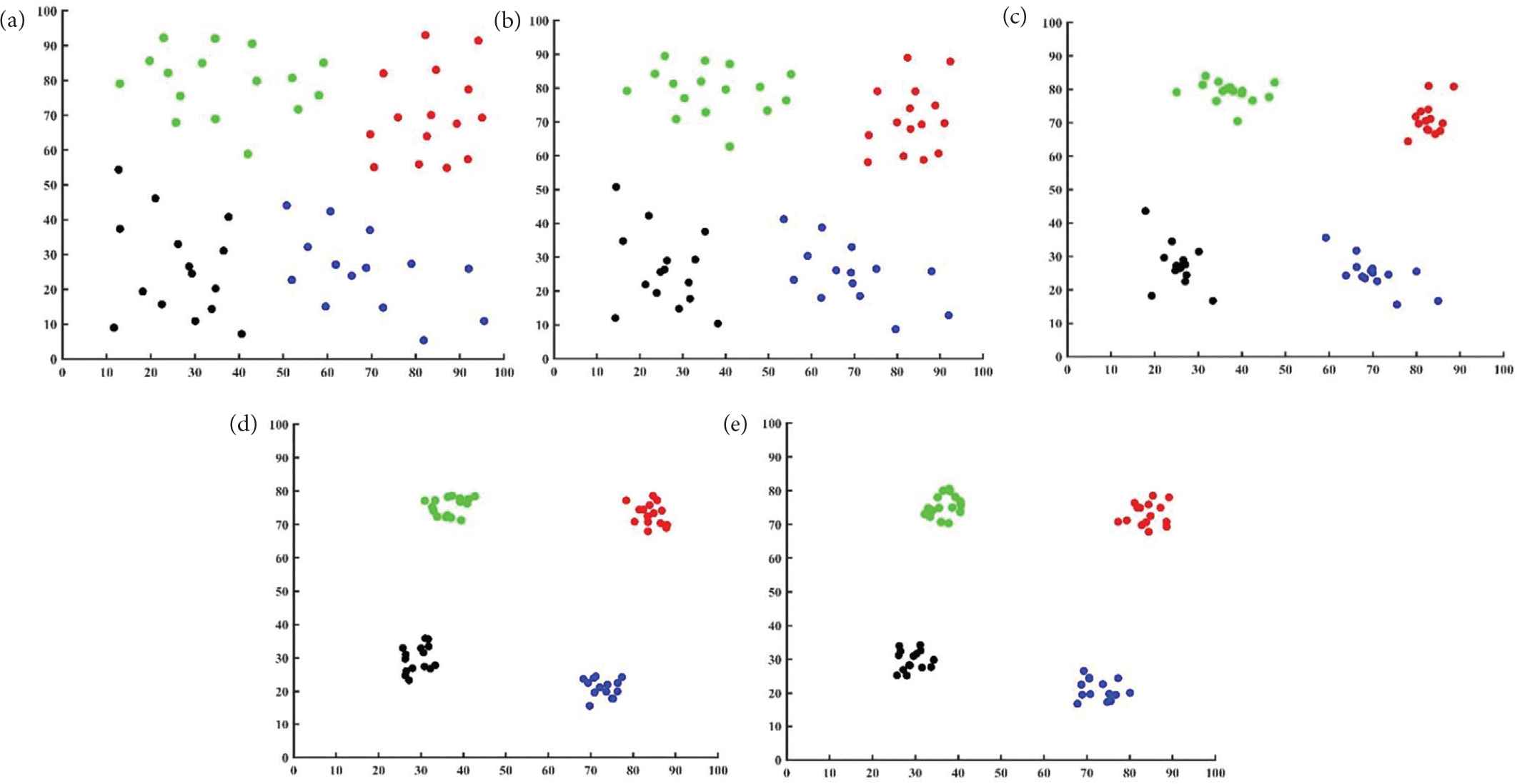 The simulation of aggregation process: (a) The initial position of four groups of robots. (b) and (c) Two processes of robot aggregation. (d) The robots have aggregated within a small range. (e) The result of aggregation.