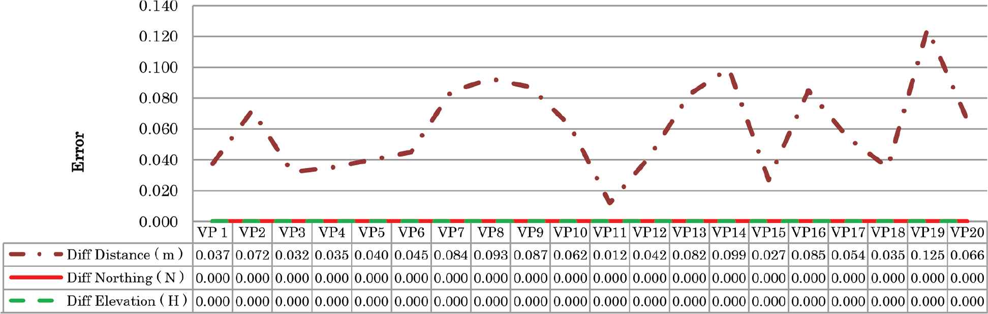 Based on Figure 3, it can be seen that the graph values of RMSE VP are for minimum and maximum errors. All the VPs are under tolerance which is below ±0.10 m. Based on Figure 4, it can be seen that the graph values of RMSE Cross Section are for minimum and maximum errors are for Different Elevation (H). The best result is ±0.03 m (VP5). VP9, VP10, and VP18 are out of tolerance which is above ±0.10 m.