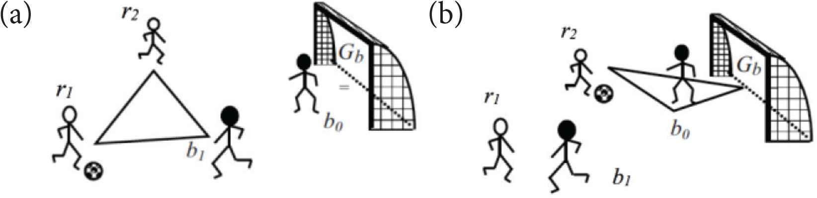 n-ary relation structures in soccer (from Johnson [6]). (a) The defender’s dilemma. (b) The goalkeeper’s dilemma.