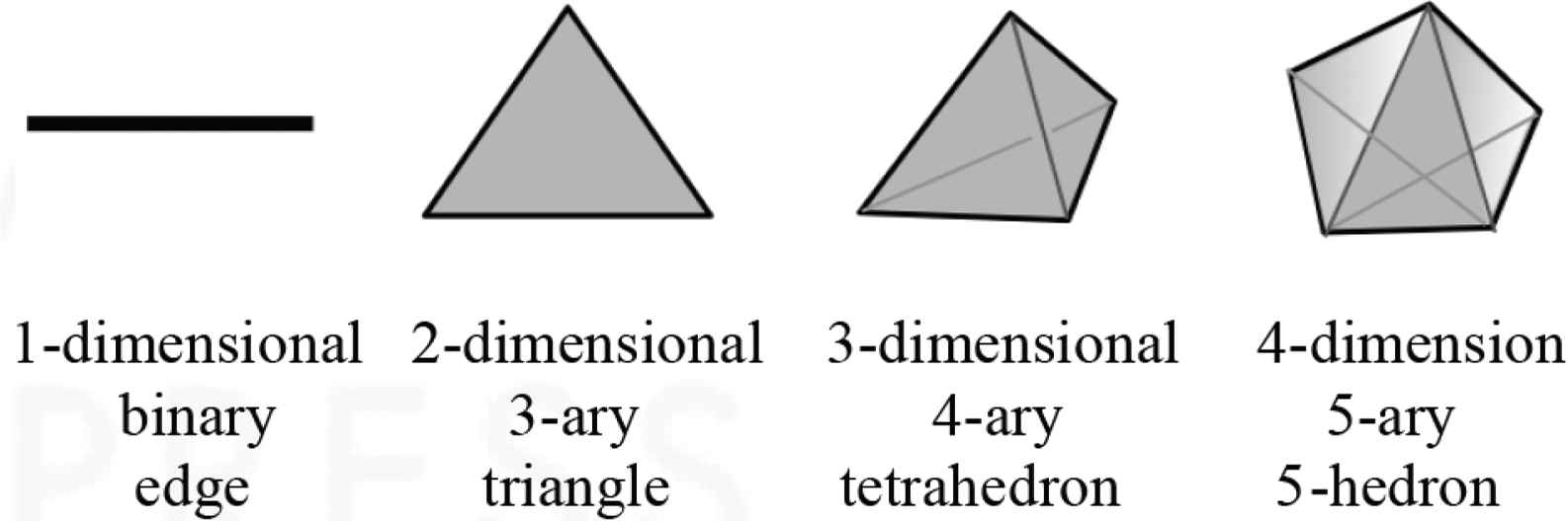 Figure 3 shows how the binary (2-ary) relations of networks can be generalised. A 3-ary relation between three players can be represented by a triangle with three vertices; a 4-ary relation between four players can be represented by a tetrahedron with four vertices; a 5-ary relation between five players can be represented by a multidimensional polyhedron with five vertices, and so.
