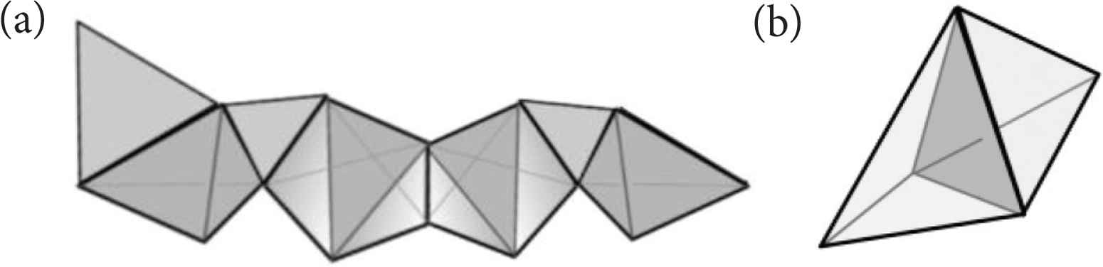 Multidimensional connectivity between hypersimplices. (a) a 1-connected chain. (b) 2-connected tetrahedra.