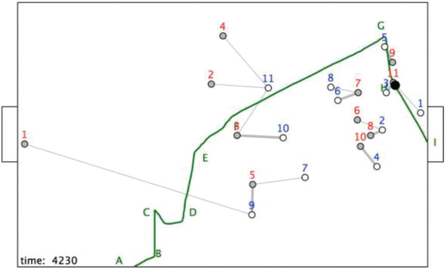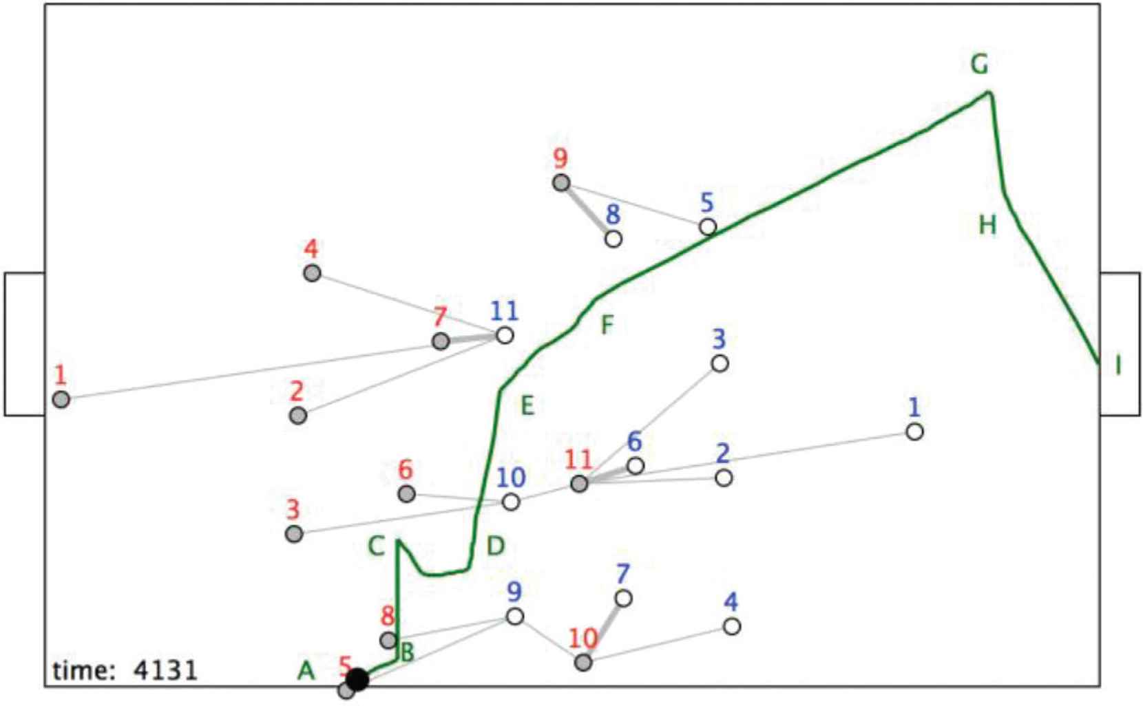 The ball is then passed from r9 to r11, who scores the goal, as shown in Figure 15.