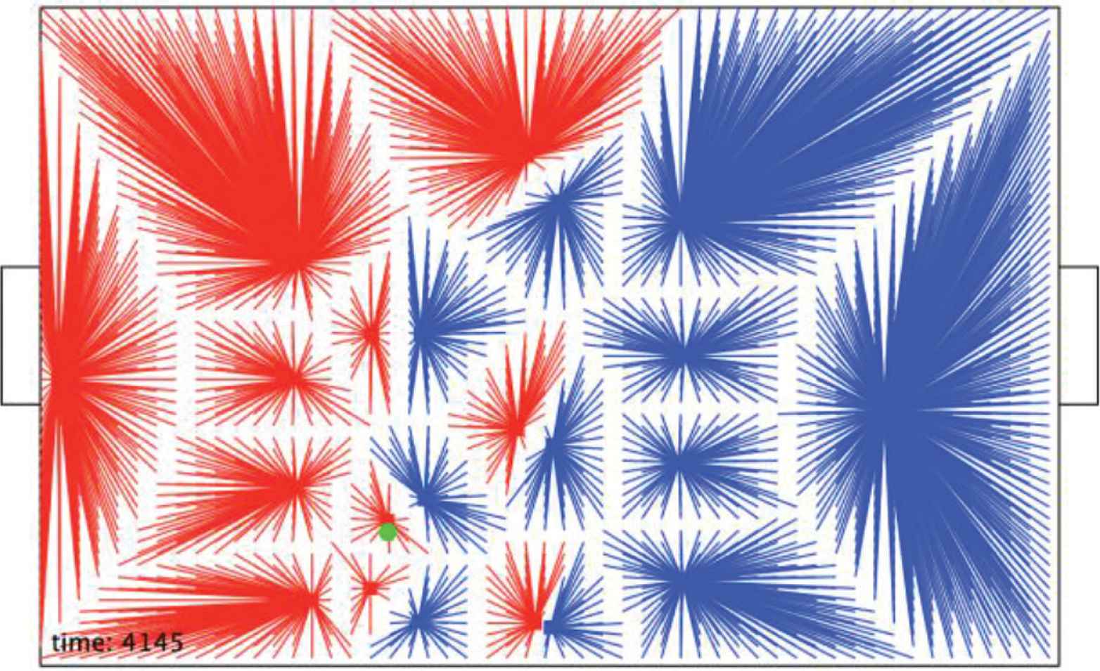 The RoboCup simulation league soccer games that will be used for illustration last for 6000 ticks of the clock (10 min if 10 ticks represent 1 s). Although it would be possible to provide information about the whole game, e.g. the percentage time each team has possession, chunks of time naturally occur over intervals as short as a 100 ticks. Figure 5 illustrates how the 6000 ticks of a soccer game can be structured by possession between the red Gliders’ team and the blue CYRUS team.