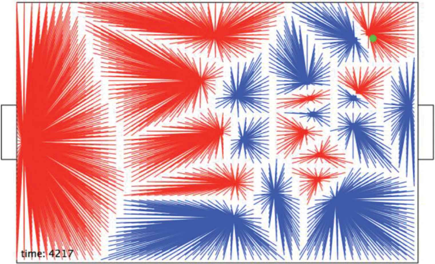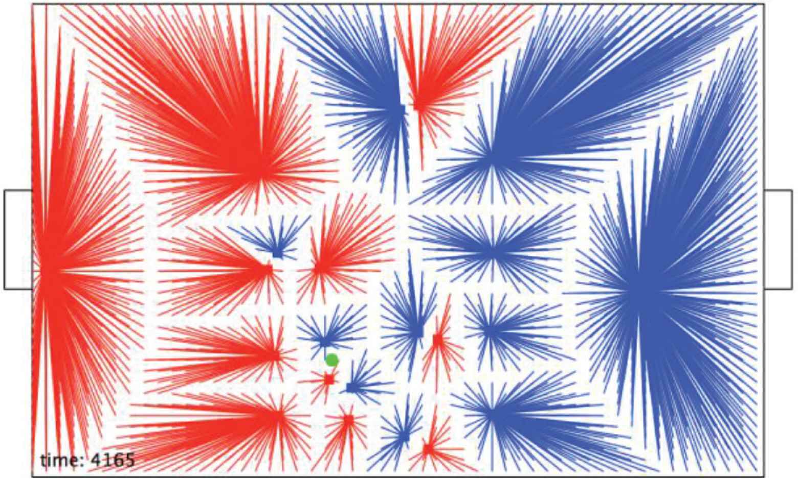Figure 8 shows the ‘closest to’ relation between the players and small areas of the pitch. At first sight this structure suggests that the red and blue teams have comparable domination of the pitch with the blue team controlling more of it.