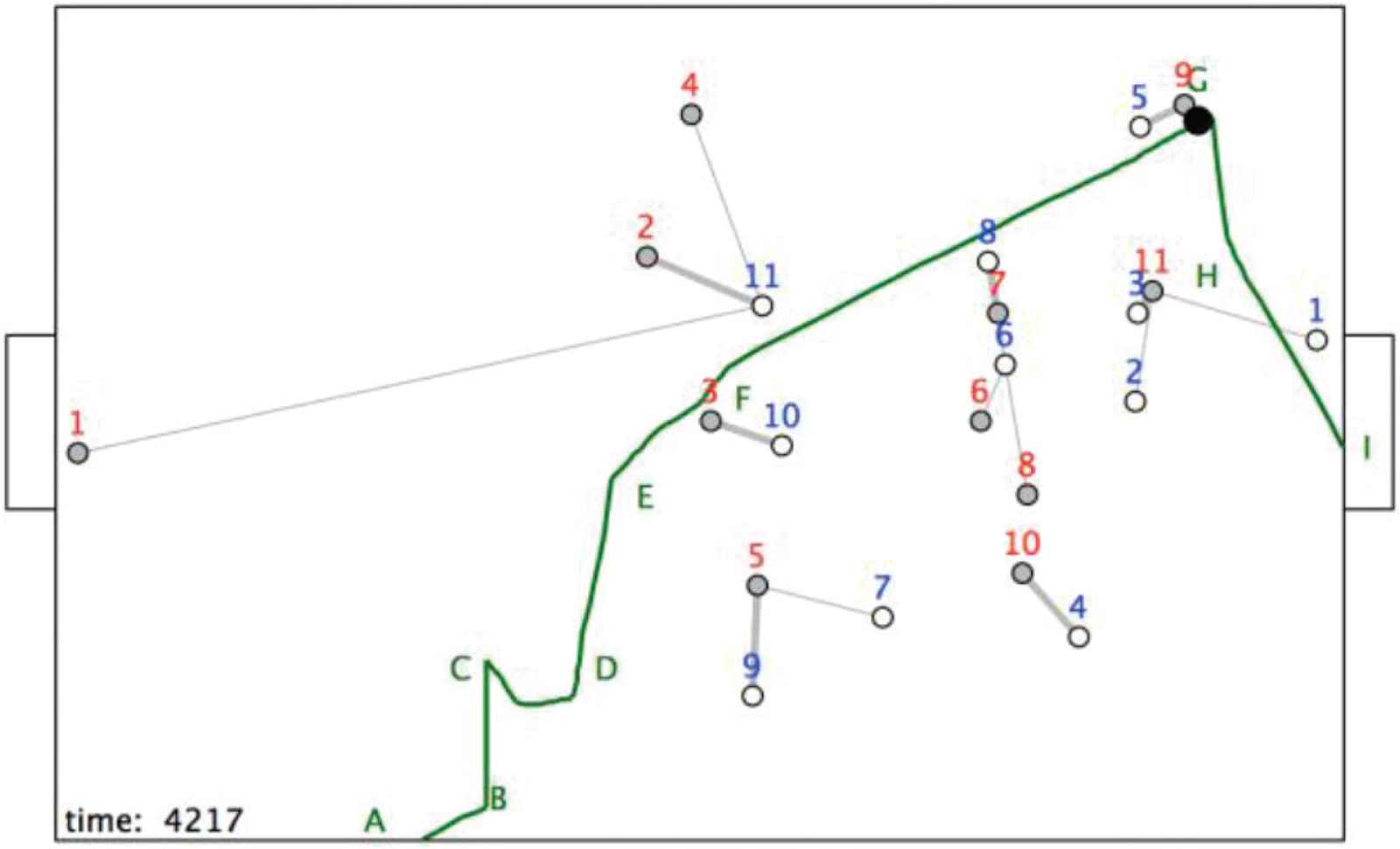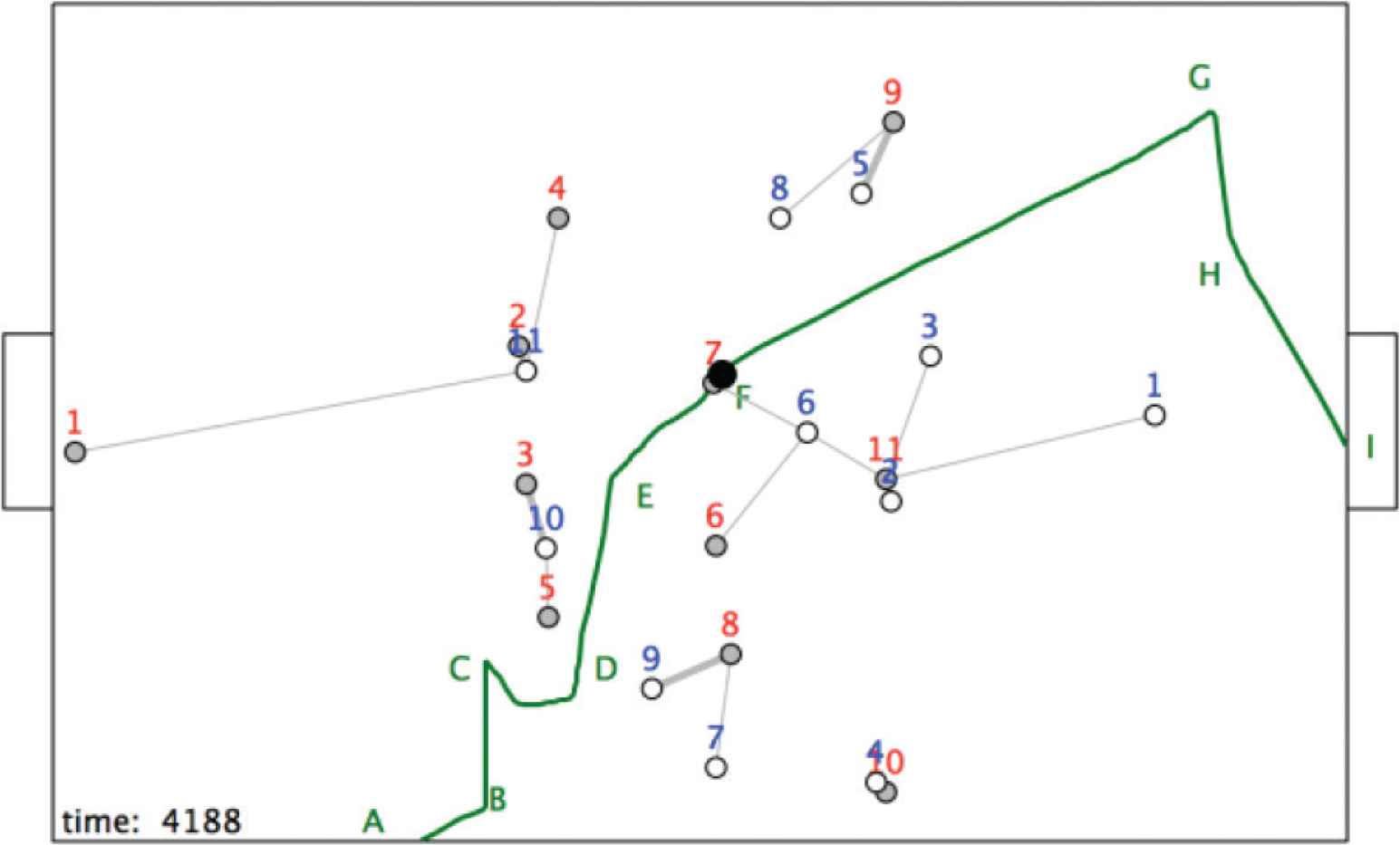 Following this pass, r7 dribbles the ball to F (Figure 11). During this time the structure <r9, b5, b8; Rc> has changed with r9 becoming closest to its target goal and b5 moving upwards – a very bad structure for blue!.