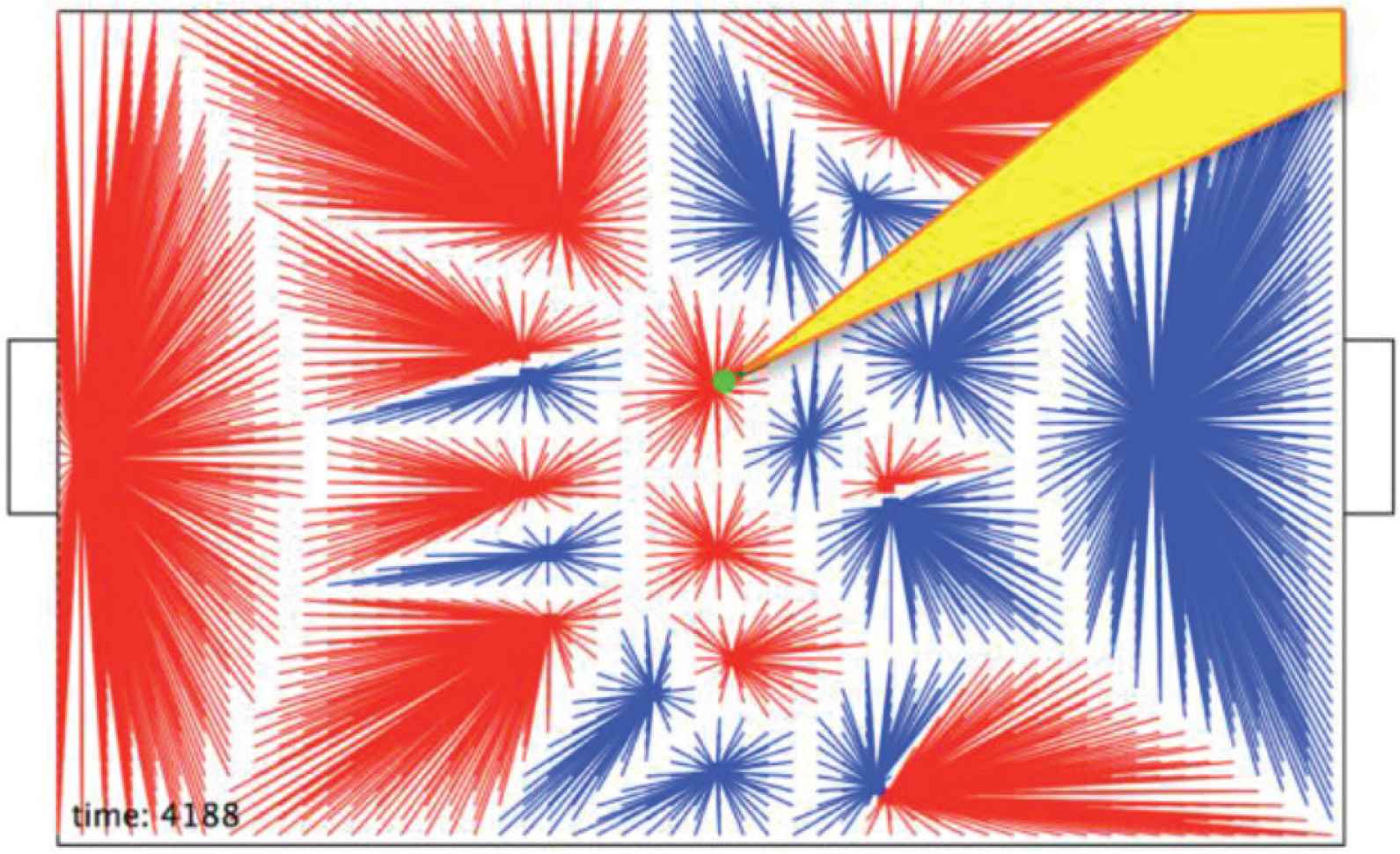 By moving in this way the blue team has allowed a “corridor” to emerge, shown as a yellow triangle in Figure 12. This provides a space for the ball to be passed into an area controlled by r9. As shown in Figure 13, r7 takes this opportunity and passes the ball to r9 at G.