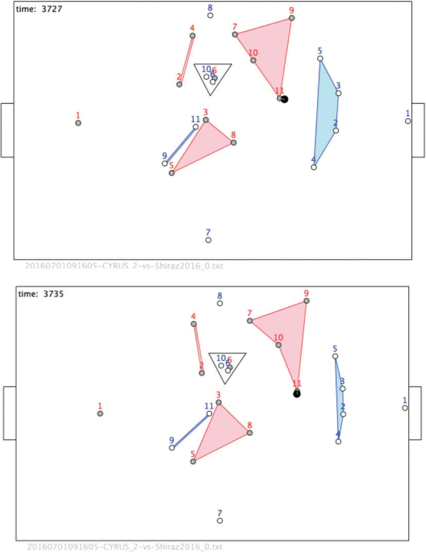 In this case a set of n players is said to be R-related if they form a polygon containing no opponents. For example, <r7, r9, r10, r11; R> is shown as a pink polygon at t = 3727. These structures are remarkably enduring in time, sometimes lasting many ticks of the clock. However, inevitably the relations change and new structure emerge. Structures of particular importance are the ‘tight’ configurations of opponent players, as illustrated by the triangle <r6, b6, b10; R>. Such configurations occur frequently in the goal area and are often precursors to scoring goals.