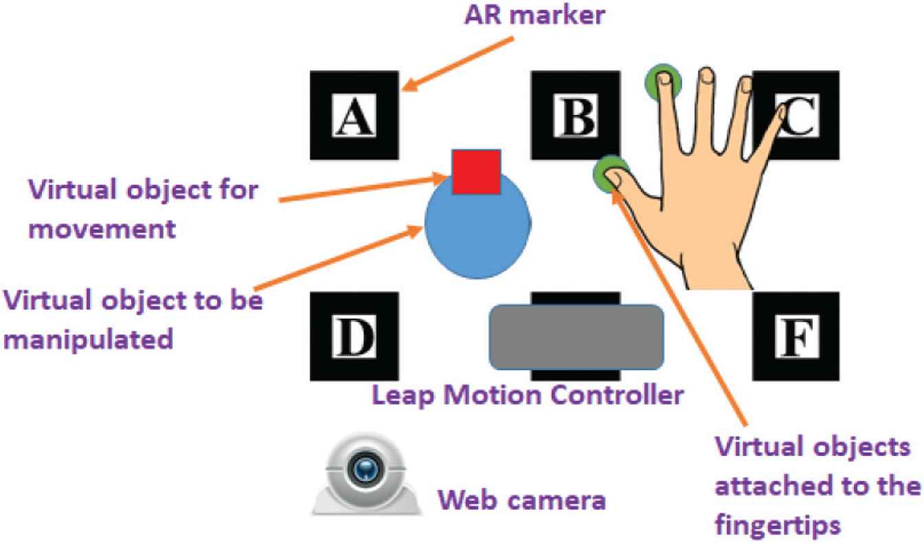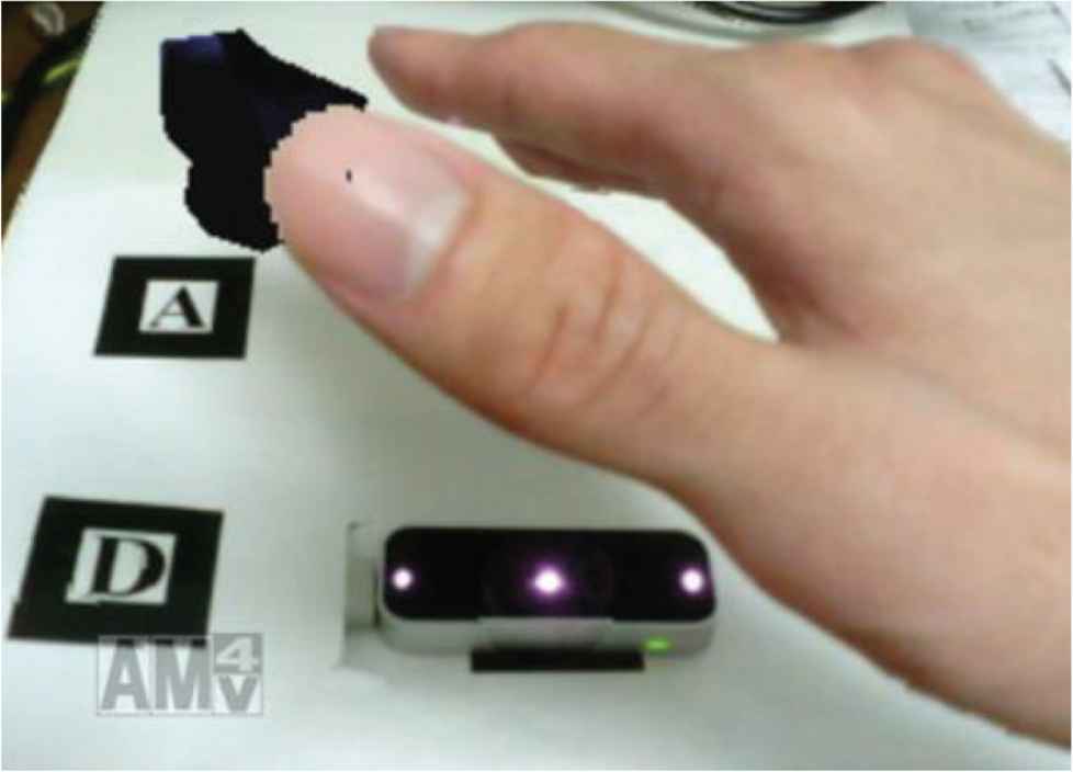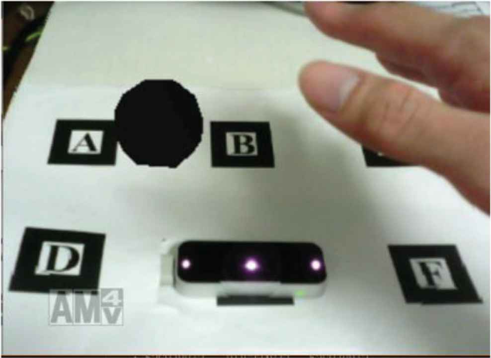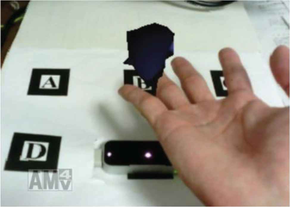 As shown in Figure 1, we place the paper on which the AR marker is printed and the Leap Motion Controller, and observe the paper with the Web camera. The virtual objects are displayed by recognizing the AR marker.