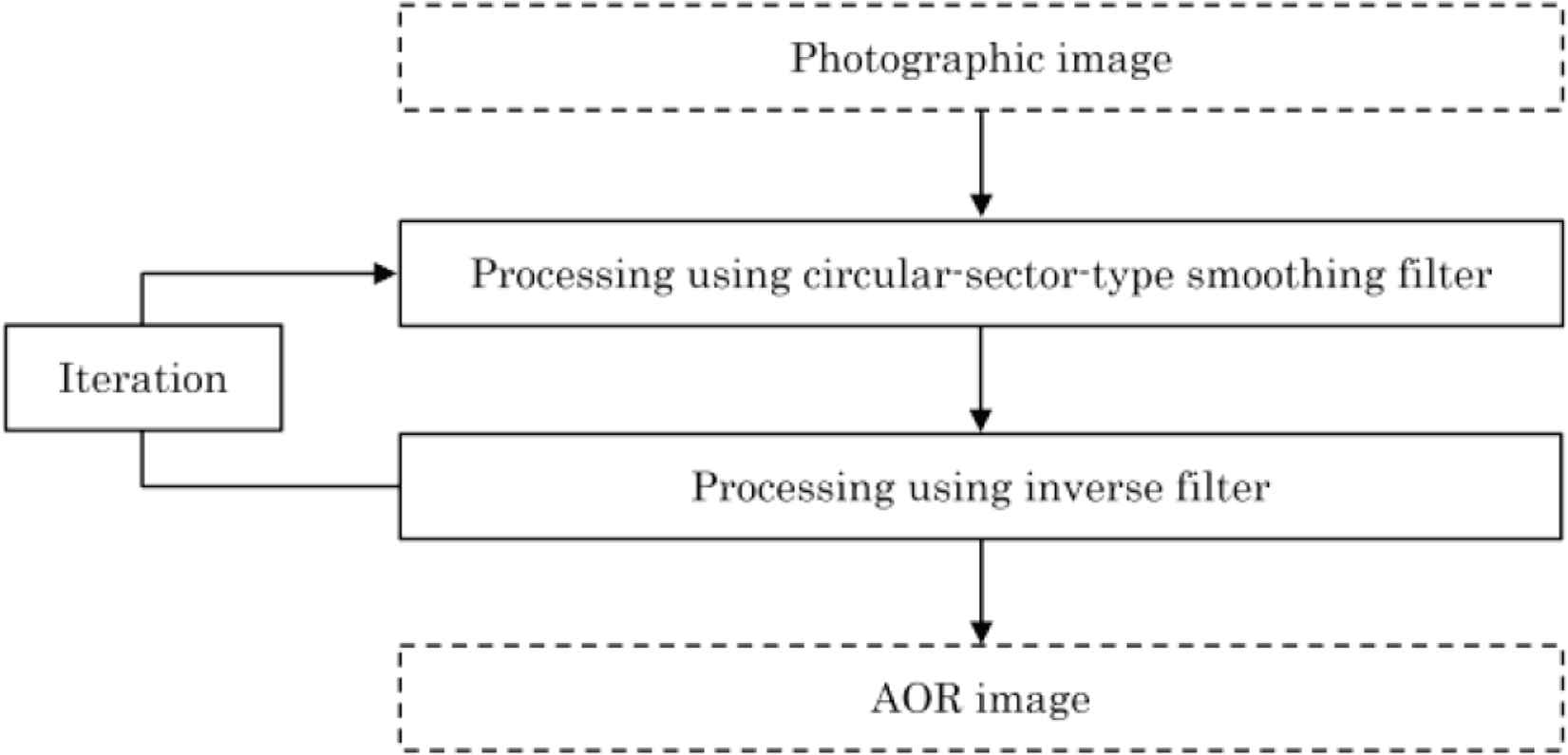 The proposed method is executed in two processes. In the first process, images are smoothed using circular-sector-type smoothing filter. In the second process, the smoothed images are restored using inverse filter. By repeating the two processes, AOR images are generated. Accumulation of errors due to the iterative process is a factor that can generate ripple patterns. A flow chart of the proposed method is shown in Figure 1. The detailed procedure in Figure 1 is shown as follows.