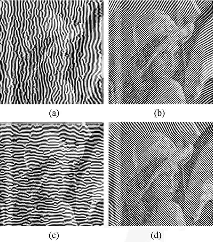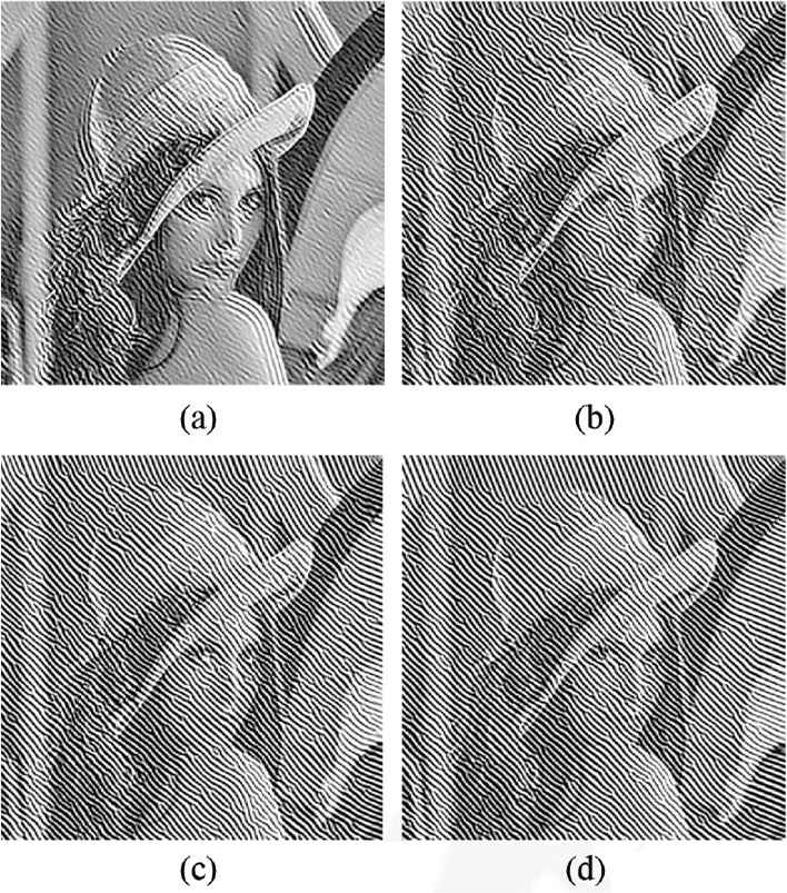 Arbitrarily-oriented ripple images by changing the angle θ2 are visually confirmed using Lenna image. The angle θ2 is set to 0, π/4, π/2, and (3/4)π. Other parameters T, D, and θ1 are set to 100, 5, and π/2, respectively. The results of the experiment are shown in Figure 8. Depending on the value of the angle θ2, the orientation of ripple patterns is changing.