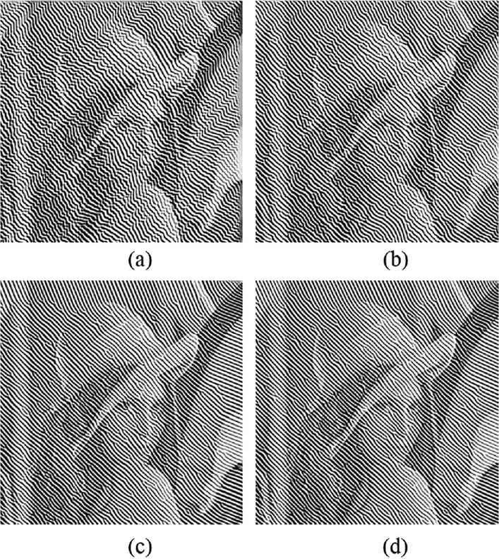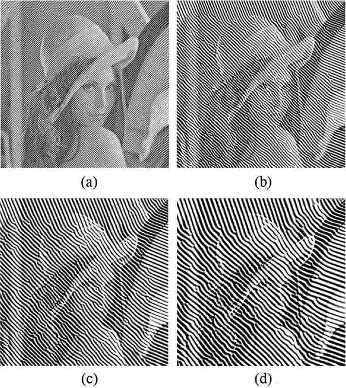 Arbitrarily-oriented ripple images by changing the radius D are visually confirmed using Lenna image. The radius D is set to 3, 5, 7, and 9. Other parameters T, θ1, and θ2 are set to 100, π/2, and π/4, respectively. The results of the experiment are shown in Figure 6. As the value of the radius D is larger, the intervals between ripple patterns become wider.