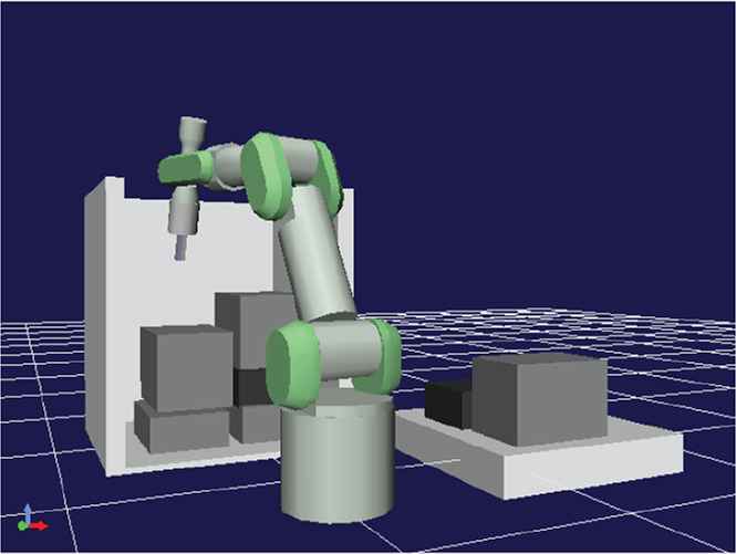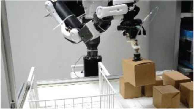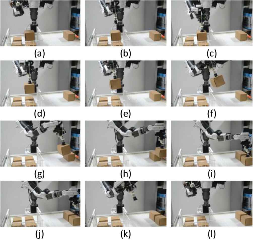 We used the industrial robot Nextage [16] equipped with a suction gripper in the right hand. To pick a box, the suction pad is placed at the upper surface of a box. We coded the planning algorithms on the robot simulation environment Choreonoid [17] and sent the motion command from Choreonoid to Nextage. To plan the robot motion, we used the PC with eight 3.10 GHz CPUs.