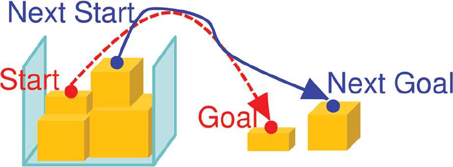When a robot loads a lot of cargo boxes onto a pallet, a robot performs the pick-and-place for a number of times with slightly changing the initial and target configurations of the robot (Figure 2). Let us consider planning the motion of a robot performing the palletizing task by using a conventional sampling based motion planning method such as the Probabilistic Roadmap Method (PRM) and Rapidly-exploring Random Tree (RRT). Although the configurations of the robot and the environment around it are similar for each pick-and-place, a motion planner usually constructs a number of roadmaps and the constructed roadmaps are not used in the next pick-and-place. This results in unnecessarily increasing the calculation time needed for motion planning. Moreover, the calculation time of the random-sampling based motion planners such as PRM and RRT changes depending on each pick-and-place. It means that the calculation time may sometimes become extremely large if the roadmaps are placed at the wrong places in the initial planning phase.