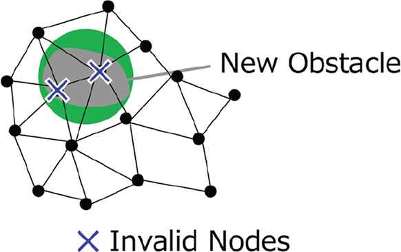 Figure 3 shows how to check collision and to modify the previously constructed roadmap graph where the newly appeared obstacle in the configuration space is marked in gray. Since it is almost impossible to precisely obtain the shape of newly appeared obstacle in the configuration space, we first assume a hyper sphere in the configuration space as shown by the green circle. We set the radius of the hyper sphere large enough to include the newly appeared obstacle. We consider checking the collision of the roadmaps constructed in the previous pick-and-place included in this hyper sphere. If the collision is detected, we consider removing the corresponding roadmaps and edges connecting these roadmaps from the roadmap graph.