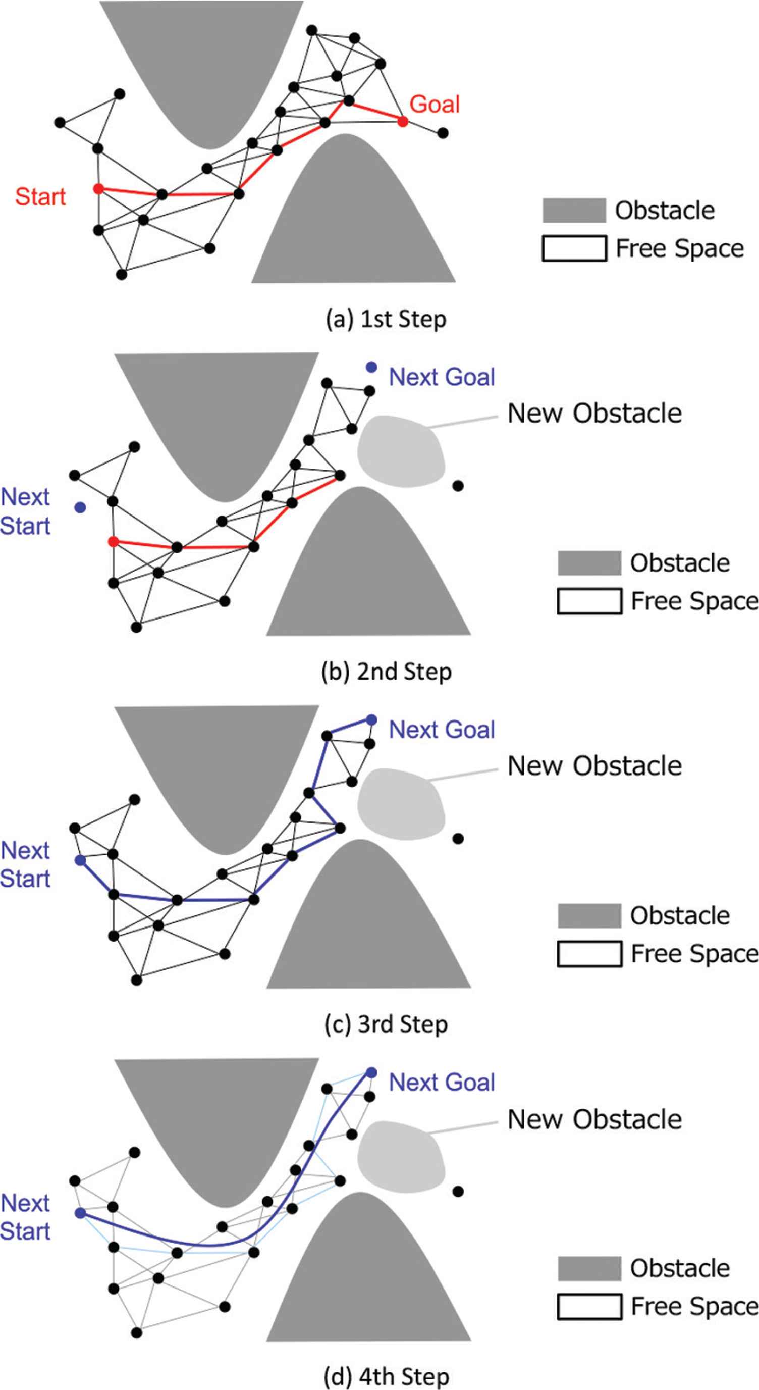 We first explain the R-PRM for reusing the previously constructed roadmap graph. The overview of the algorithm is shown in Figure 4 where white and gray denote the free space and obstacle, respectively. Red and blue lines denote the previously found path and the path to be planned, respectively.