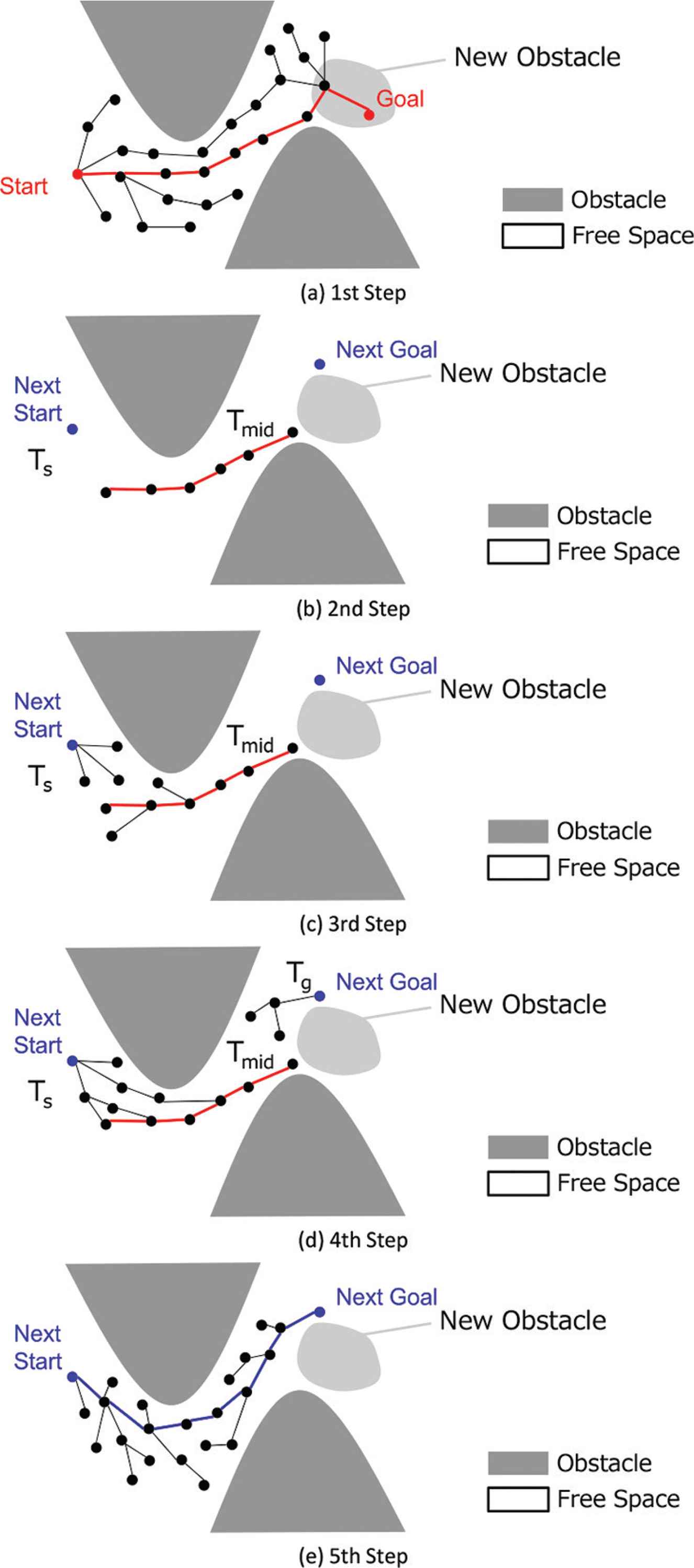 After the second and subsequent pick-and-place, we first connect Tmid with the new initial configuration, and then connect Tmid with the new target configuration. Let Ts and Tg be the roadmap trees rooted at the initial and the target, respectively. First, by expanding both Ts and Tmid, we try to connect Ts and Tmid by using the RRT* as shown in Figure 5c. Then, by expanding both Tg and Tmid by using the RRT* as shown in Figure 5d.
