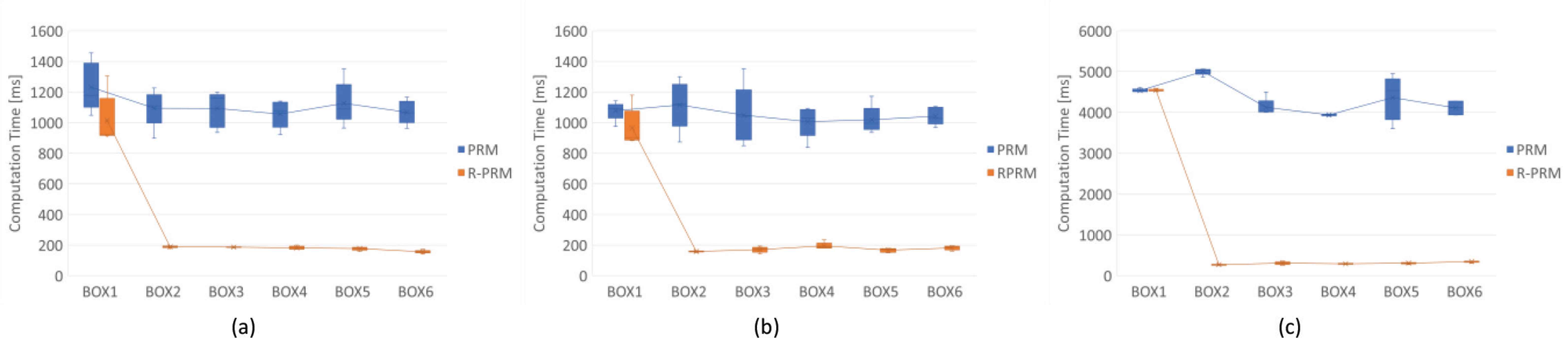 Figures 10 and 11 show the comparison of calculation time between PRM and R-PRM and between RRT* and R-RRT*, respectively. In each figure, a–c show the result of EX1, EX2 and EX3, respectively. The vertical and the horizontal axes show the calculation time and the number of pick-and-place trial, respectively. We can see from these figures that the calculation time after second and subsequent pick-and-place has been improved in case of R-PRM and R-RRT* where the calculation time is <400 (ms) for all the experiments. Variation of the calculation time appeared in PRM and RRT* is reduced in R-PRM and R-RRT*. In EX1 and EX2, all the algorithms did not fail in finding a solution. On the other hand, in EX3, PRM failed in finding a solution for nine times out of 30 times pick-and-place while R-PRM never failed in finding a solution. This is because R-PRM and R-RRT* re-uses the previous roadmaps and likely to successfully find a solution.