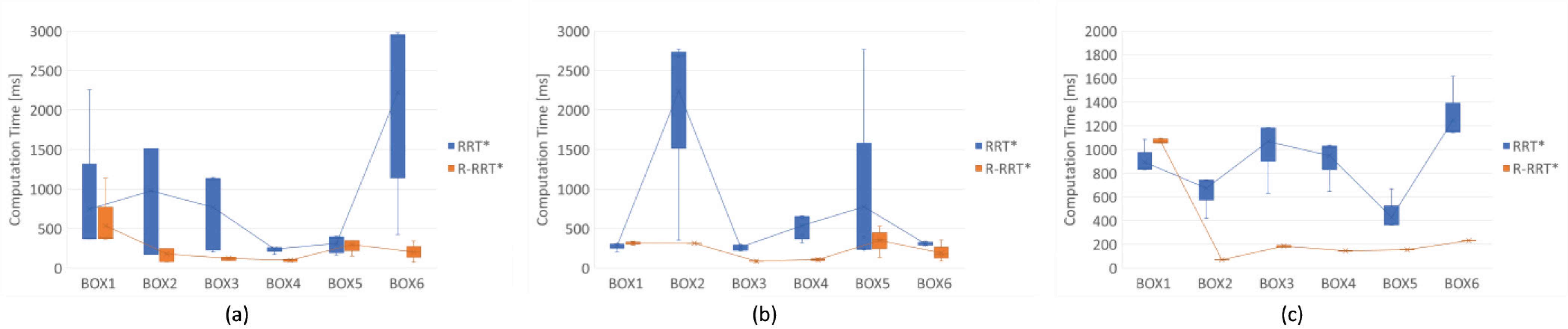 Results of RRT* and R-RRT*. (a) EX1, (b) EX2, (c) EX3.