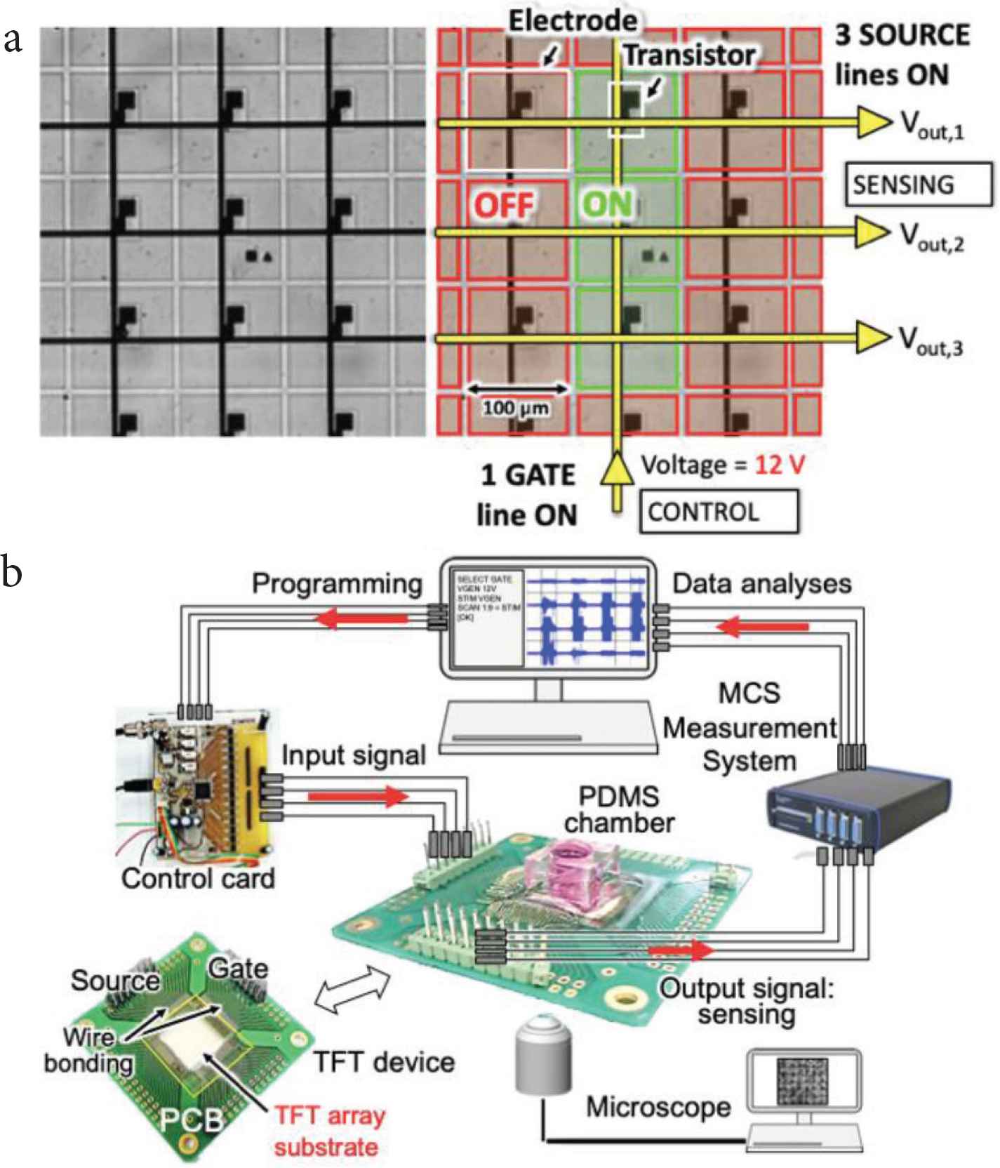 (a) Working principle of the transparent TFT substrate, with a close-up view of the array of 100 μm2 microelectrodes. (b) Experimental setup.