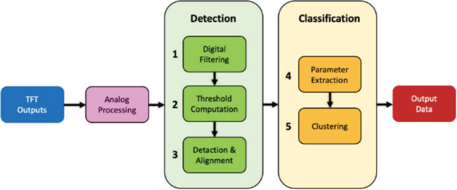 Embedded signal processing is an essential step in the development of recording instrumentation. Here, a spike sorting algorithm was used for electrophysiological data analysis. This data processing technique consists in identifying the spiking activities of cells that contribute to the signal recorded by each microelectrode [4]. The identified basic functions are: (1) bandwidth reduction for selective band amplification and noise reduction; (2) discrimination threshold computation; (3) detection and alignment of biological spike signals; (4) extraction of spike shape features; and finally (5) spike clustering. Those functions are depicted in Figure 2.