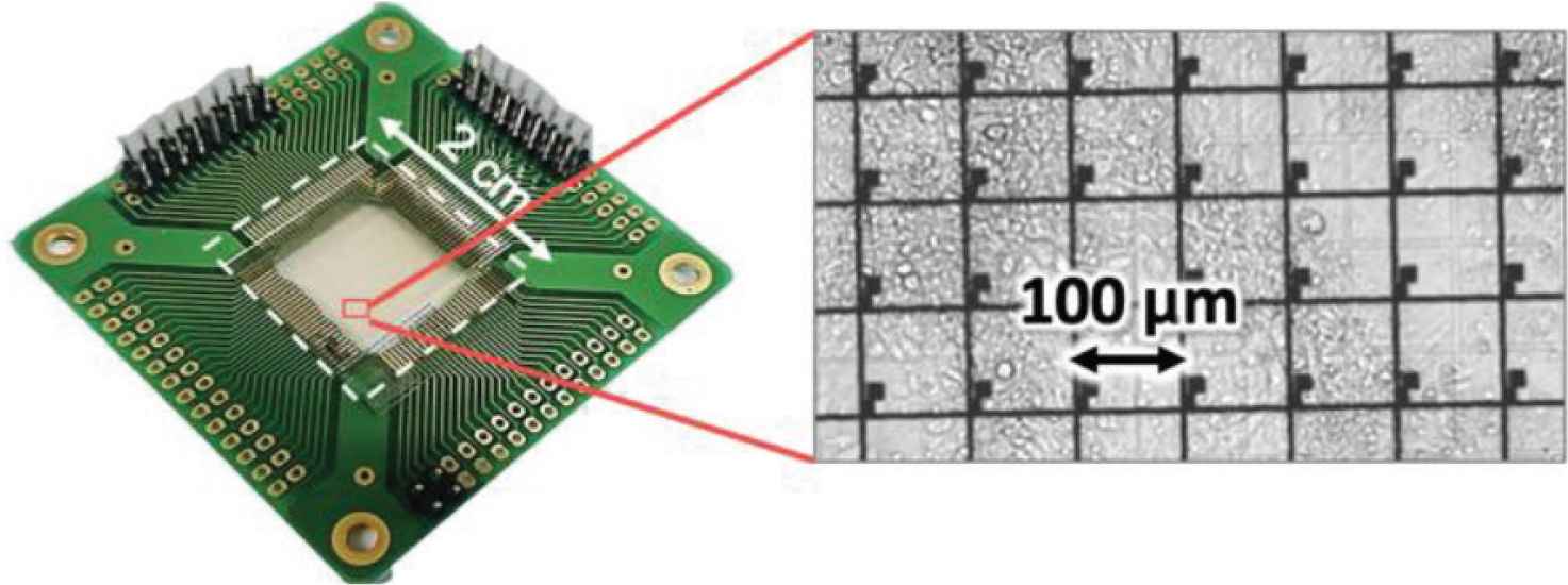 The standard type of TFT array comes in a pattern of 150 × 150 transparent microelectrodes and is mounted on a printed circuit board. Microelectrodes are composed of indium tin oxide with a size of 100 × 100 µm2. The array of microelectrodes is controlled by an array of TFTs, which are used for switching ON/OFF the microelectrodes. The TFTs are controlled by means of gate and source/drain lines. The columns of the array control the gates of the TFTs, while the rows control the sources. When a 12 V DC voltage is applied to one gate line, all the microelectrodes connected to that line are activated. One or more source lines are then connected to a measurement system for sensing.