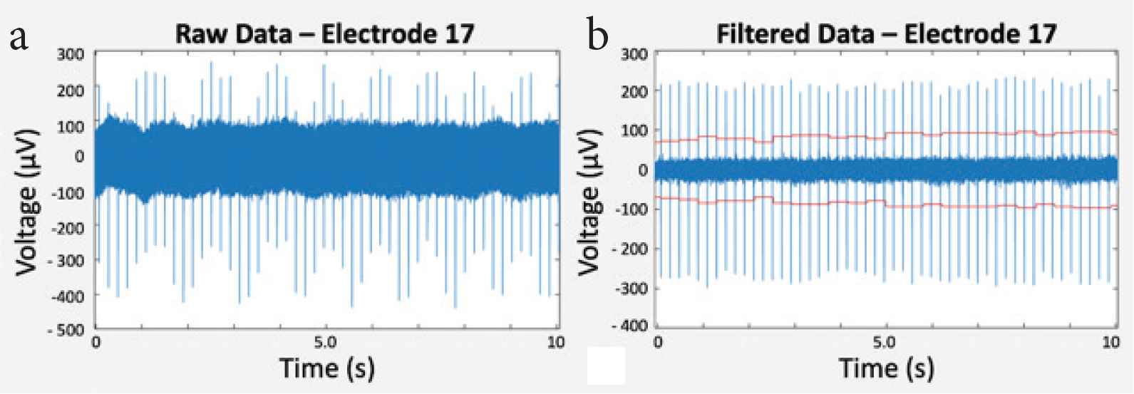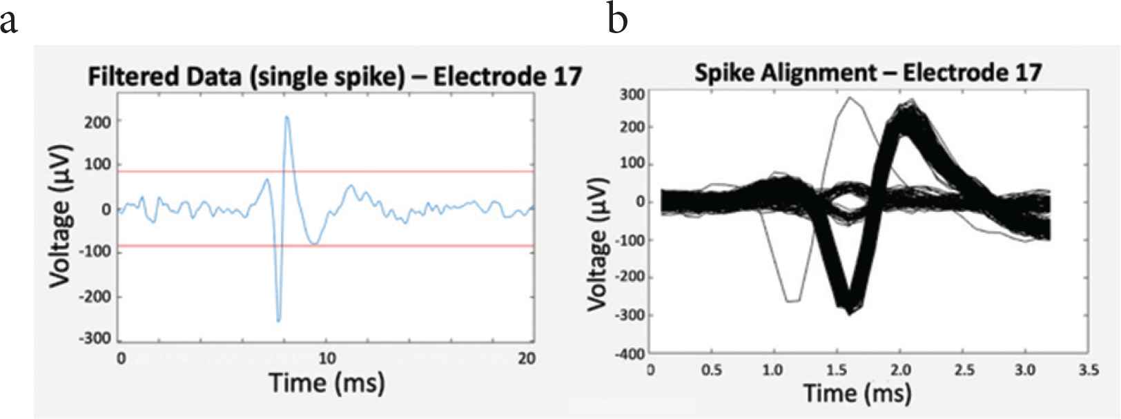 (a) Filtered data (blue) and threshold lines (red) for spike detection, and (b) spike alignment.