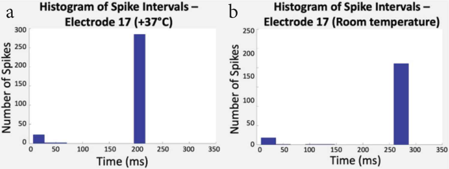 Spike intervals were then classified. Figure 6 shows the histograms that display the number of spikes according to their time intervals on one electrode at two temperatures.